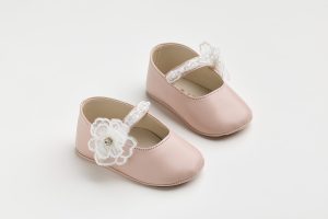 Μπαλαρίνα αγκαλιάς σε ροζ τεχνόδερμα με χάντρες, πέρλες και oFF white κεντητό λουλούδι με στρας