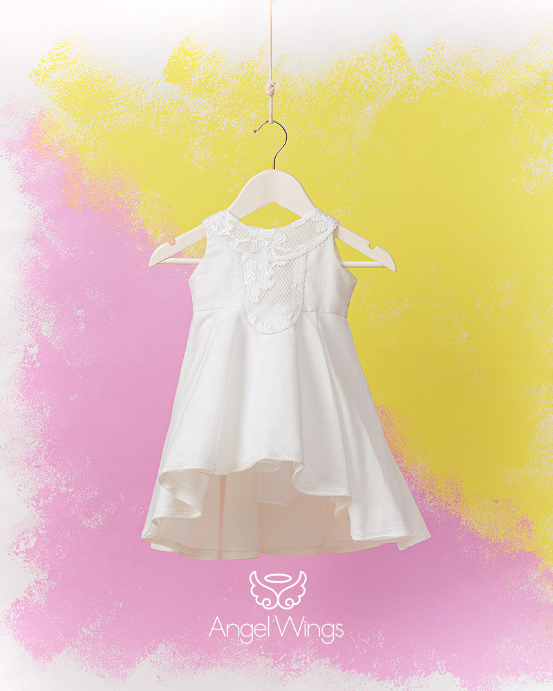 Ένα γοητευτικό και εκλεπτυσμένο φόρεμα που συνδυάζει φυσική κομψότητα και πολυτέλεια, φτιαγμένο από φίνο λινό ύφασμα και διακοσμημένο με εκλεπτυσμένα απλικέ λουλούδια από γαλλική δαντέλα, σε διαχρονική off-white απόχρωση.