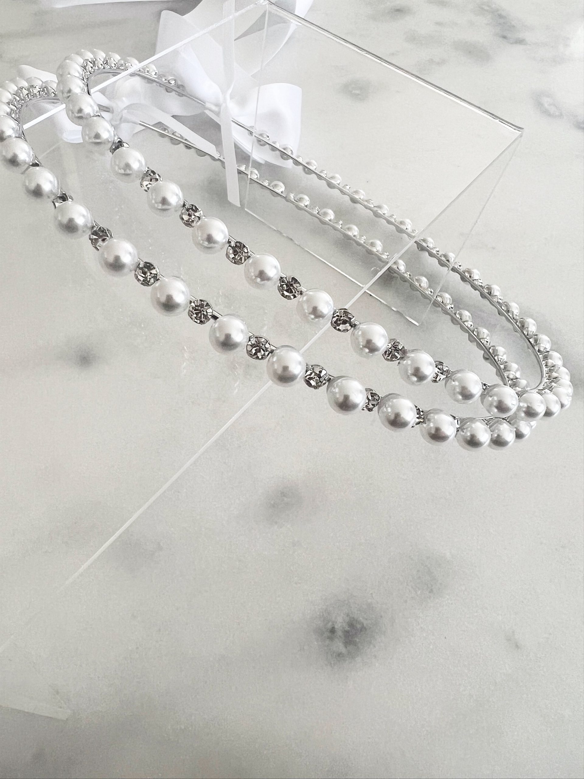 Αριστοκρατικά στέφανα με έναν εκπληκτικό συνδυασμό από λαμπερά λευκά μαργαριτάρια και κρύσταλλα 8 χιλιοστών για μια κλασική και διαχρονική εμφάνιση.