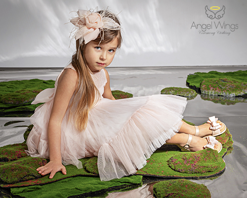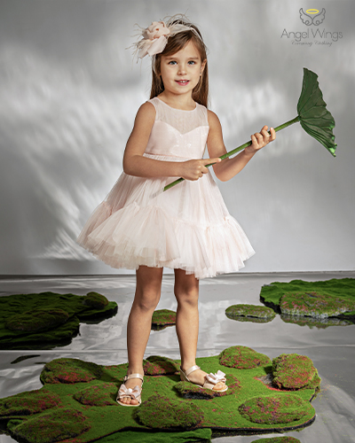 Το διάφανο μπούστο από φίνο τούλι συνδυάζεται αρμονικά με ύφασμα παγιέτας που ντουμπλάρεται στο στήθος, δημιουργώντας ένα εκλεπτυσμένο παιχνίδι διαφάνειας και διακριτικής λάμψης, το οποίο συνεχίζεται και στην πλάτη, προσδίδοντας ιδιαίτερη κομψότητα στο σχέδιο.Η εντυπωσιακή εμφάνιση ολοκληρώνεται με έναν μεγάλο, ρομαντικό φιόγκο από οργαντίνα στο πίσω μέρος, που χαρίζει επιπλέον φινέτσα και θεατρικότητα στο φόρεμα. Το σύνολο συμπληρώνεται ιδανικά με τούλινη κορδέλα μαλλιών, διακοσμημένη με μεγάλο χειροποίητο λουλούδι και φίνα φτερά στην ίδια απόχρωση, δημιουργώντας ένα αρμονικό και ιδιαίτερα κομψό αποτέλεσμα.