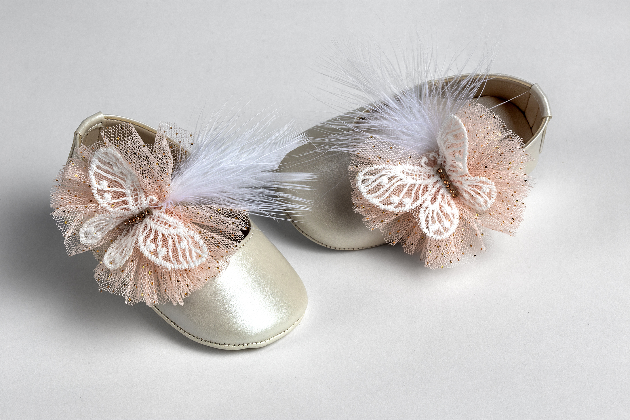 Μπαλαρίνα αγκαλιάς σε εκρού τεχνόδερμα διακοσμημένη με τούλι, φτερό και πεταλούδα από δαντέλα. Νούμερα 16-19.