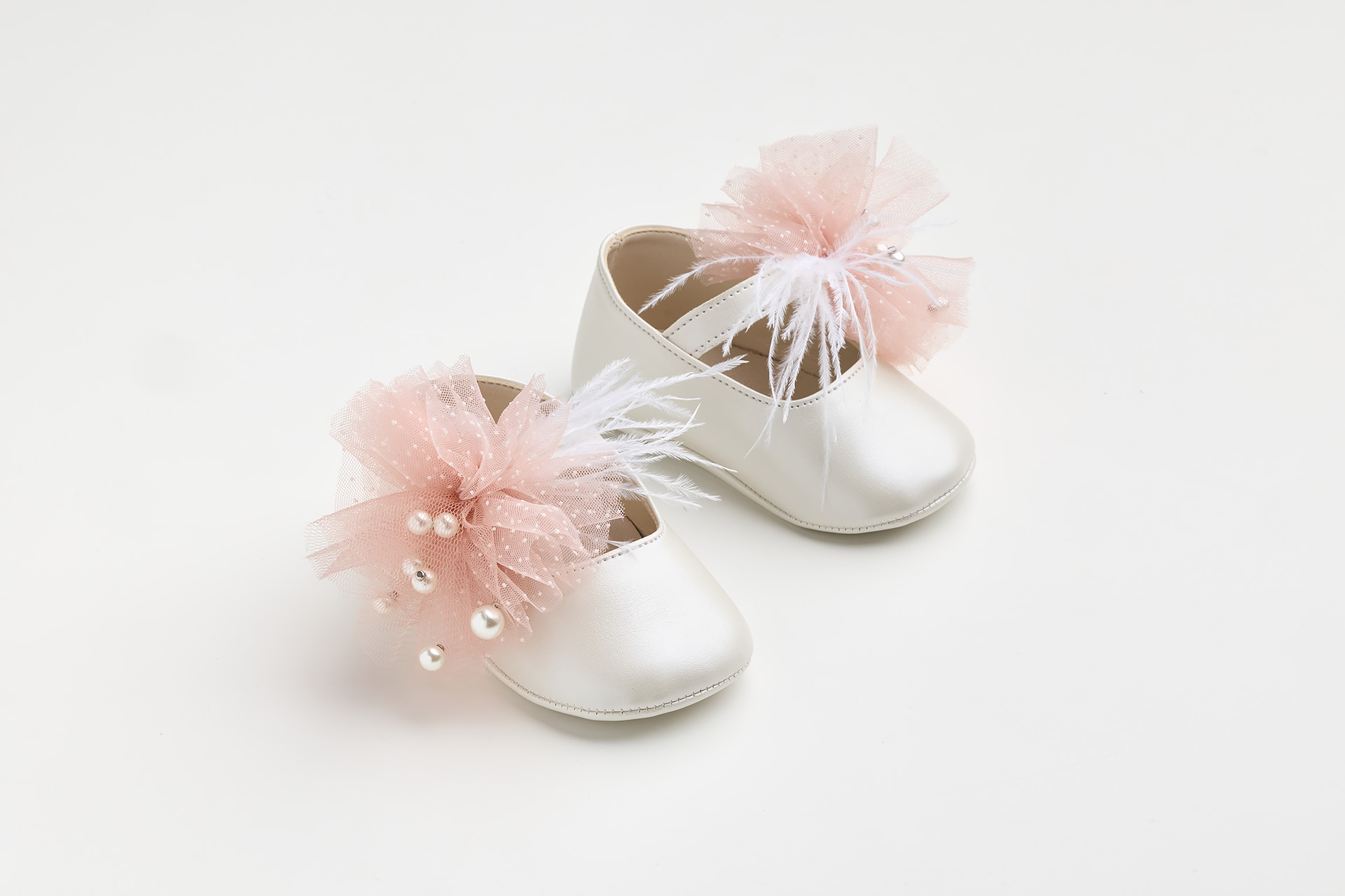 Μπαλαρίνα αγκαλιάς σε εκρού τεχνόδερμα με χειροποίητο διακοσμητικό από σάπιο μήλο πουα τούλι πέρλες και φτερά