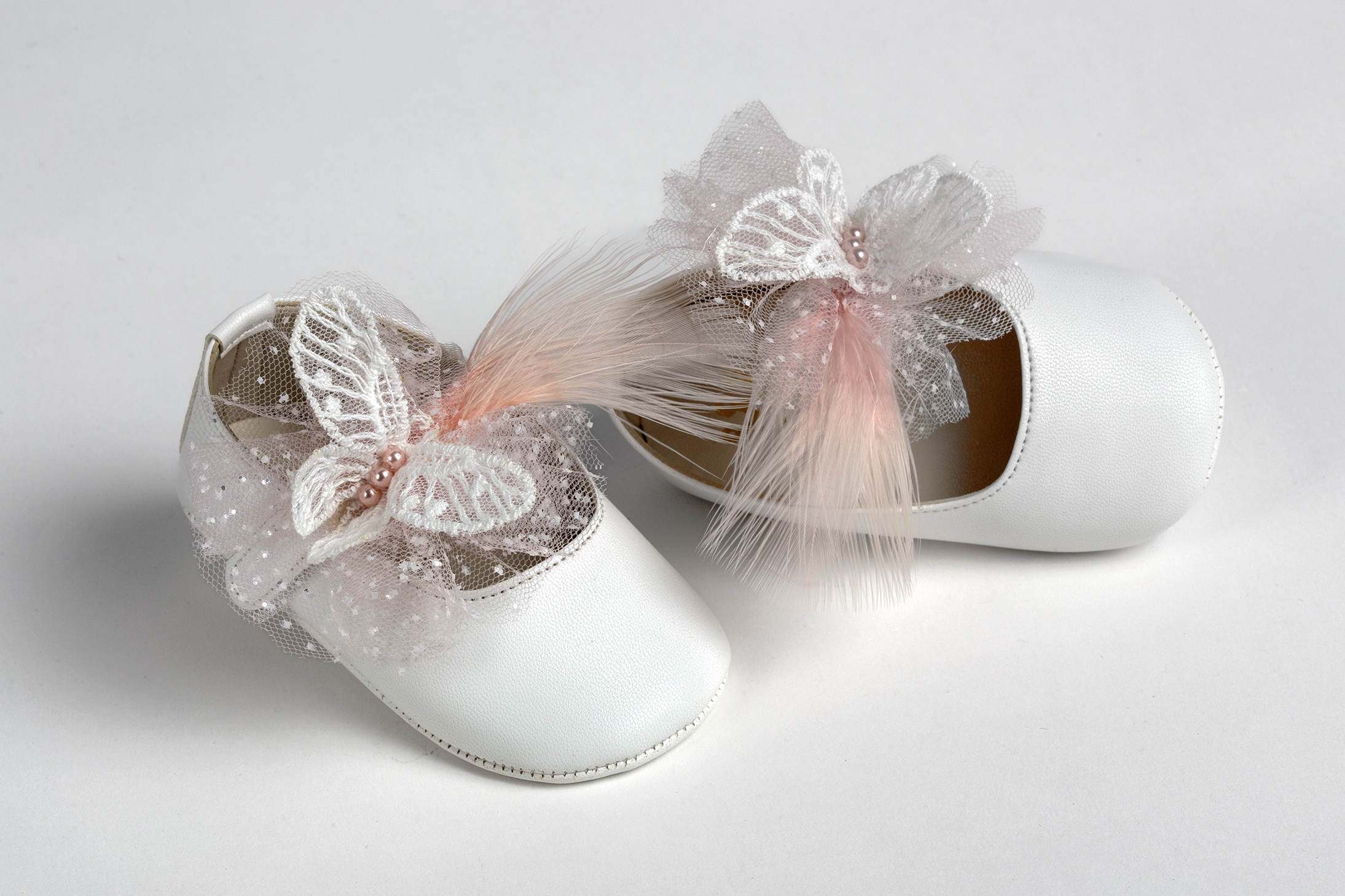 Μπαλαρίνα αγκαλιάς σε λευκό τεχνόδερμα, διακοσμημένη με τούλι, φτερό και πεταλούδα από δαντέλα. Νούμερα 16-19.
