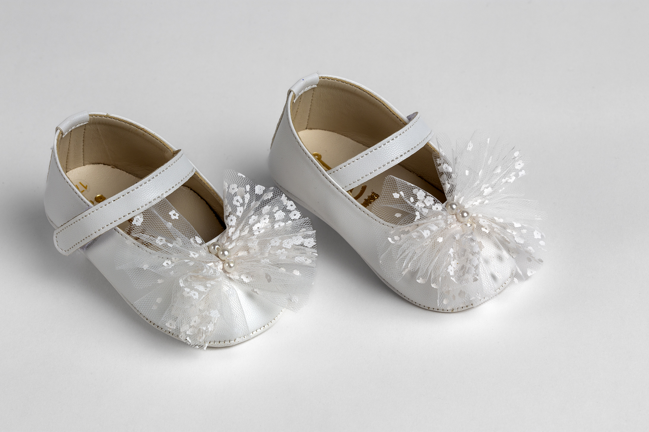 Μπαλαρίνα αγκαλιάς σε λευκό τεχνόδερμα με διακοσμητικό τούλινο φιόγκο σε λευκό. Νούμερα 16-19.