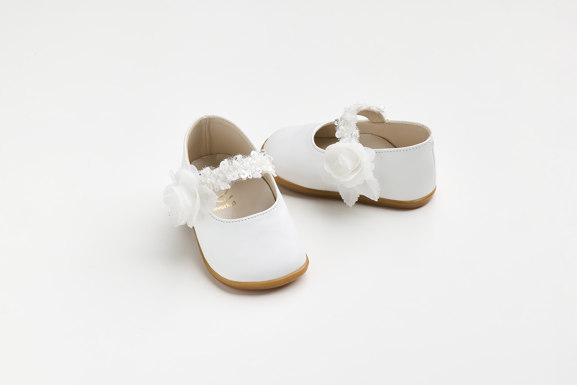 Μπαλαρίνα για τα πρώτα βήματα σε λευκό τεχνόδερμα με παγιέτες και τριανταφυλλάκι.