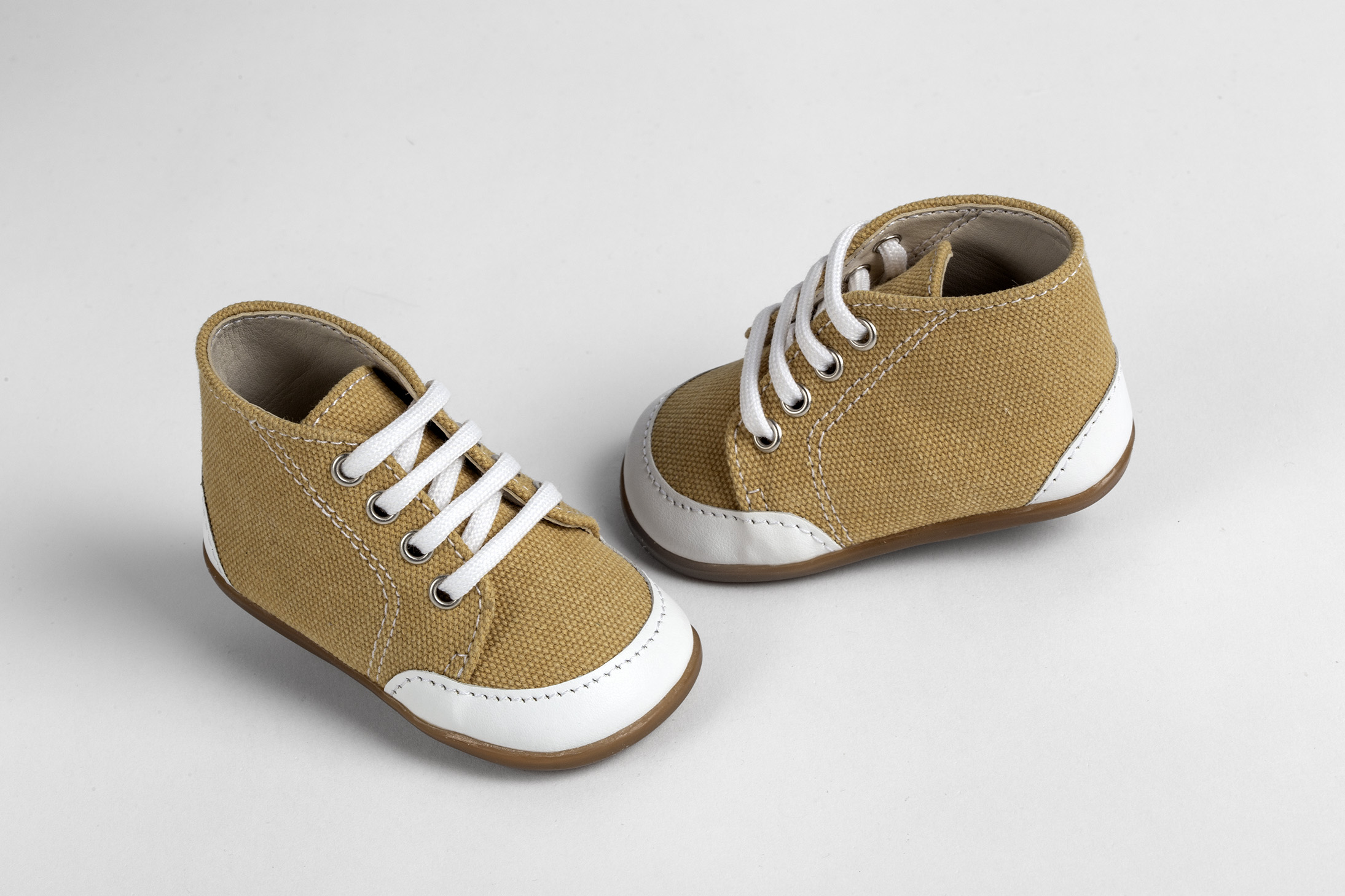 Μποτάκι για τα πρώτα βήματα σε ταμπά δέρμα και μπεζ ύφασμα