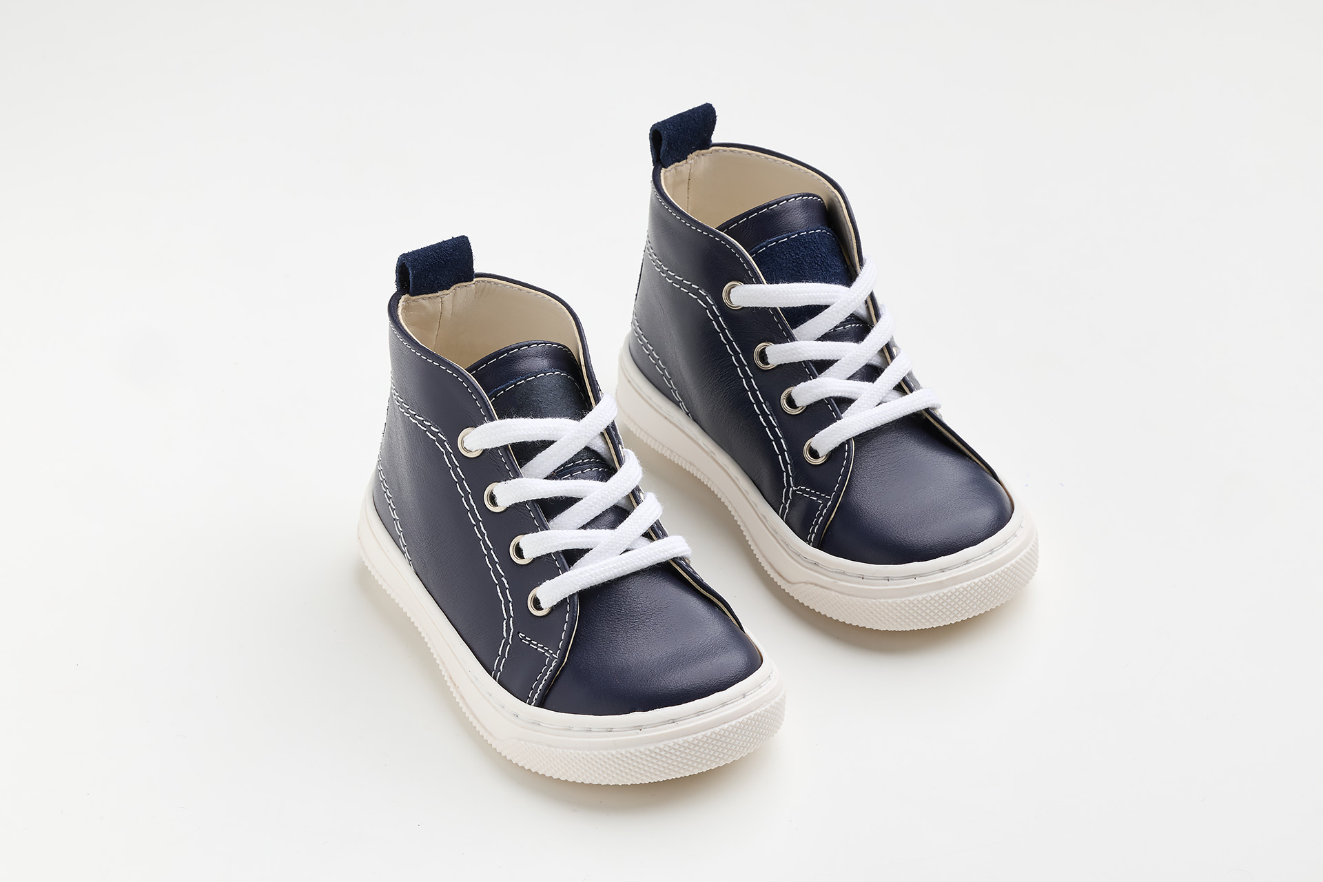 Μποτάκι περπατήματος σε μπλε λείο δέρμα και λεπτομέρεια από μπλε καστόρ δέρμα.