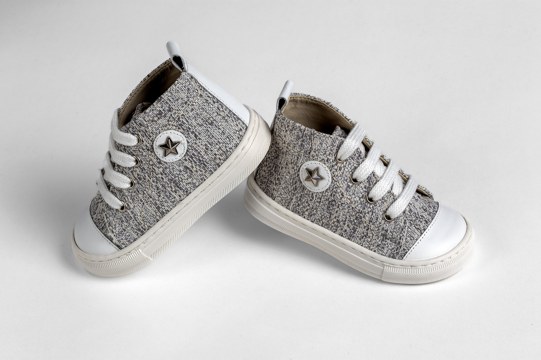 Μποτάκι περπατήματος σε γκρι ύφασμα και λευκό δέρμα. Νούμερα 19-27.