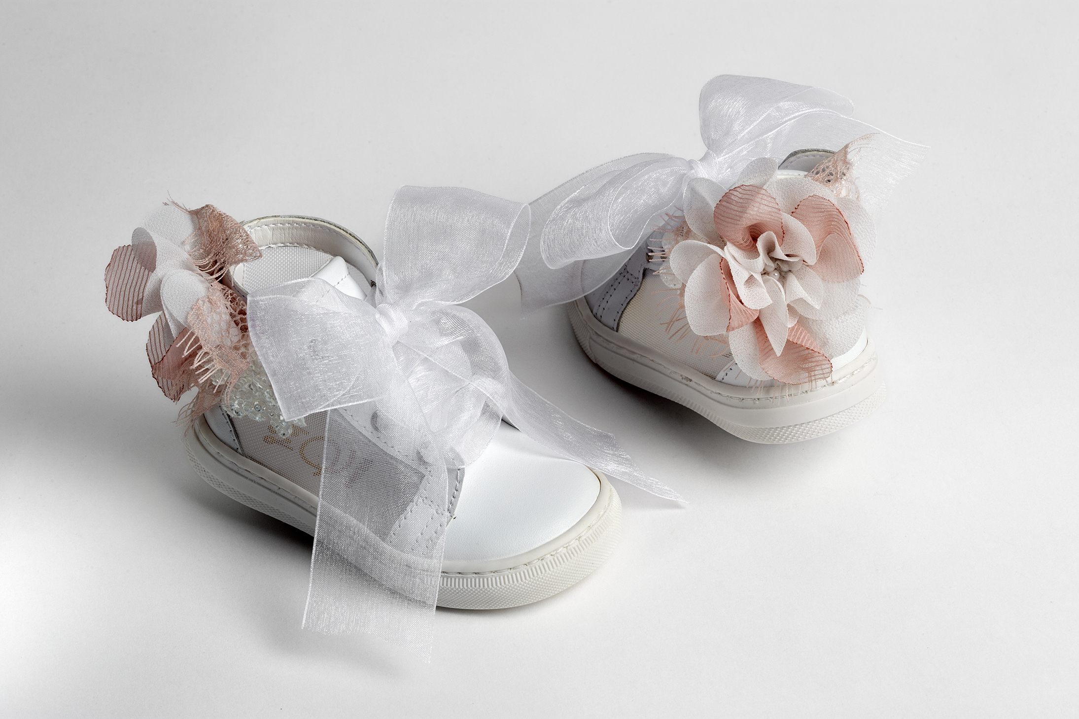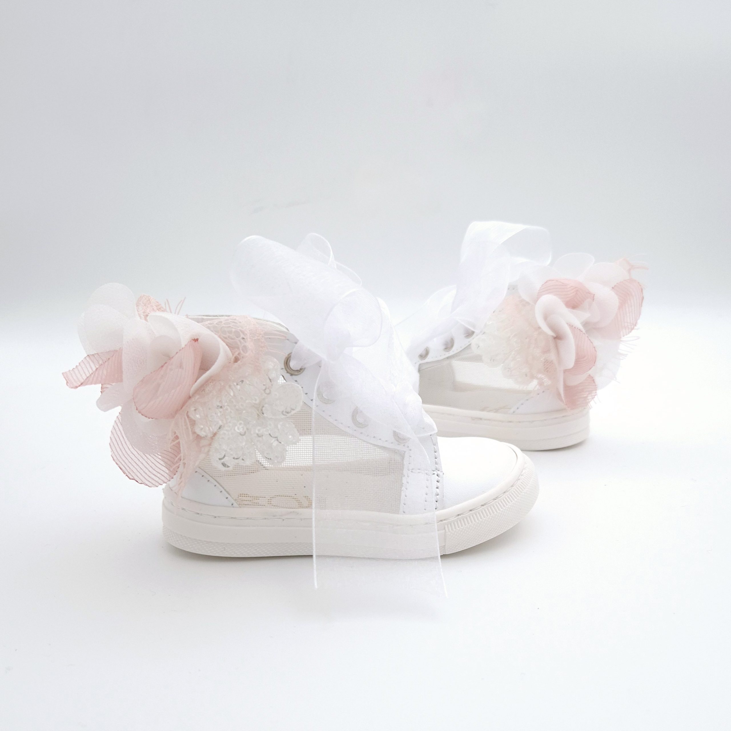 Μποτάκι περπατήματος σε λευκό δέρμα και διαφάνεια, διακοσμημένο με λουλούδι σε λευκό και dusty pink. Νούμερα 19-27
