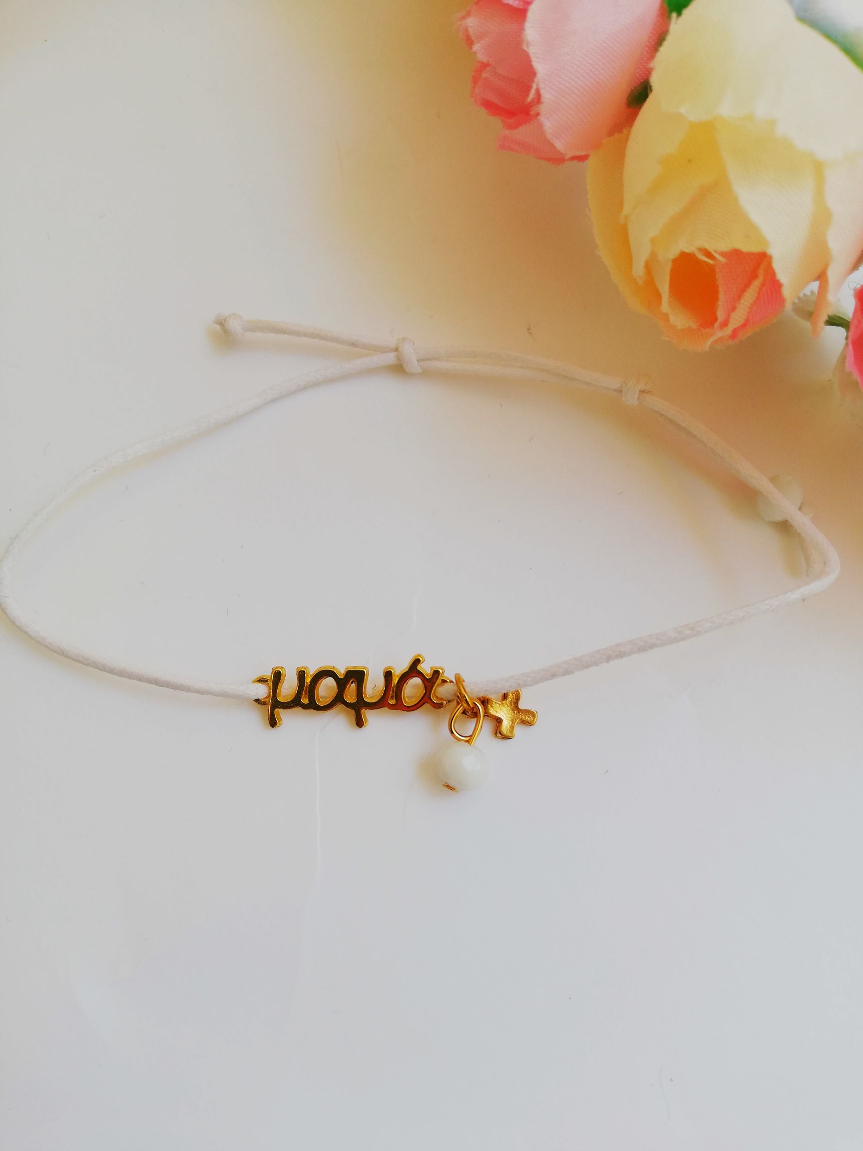 Χειροποίητα βραχιολάκια με κορδόνι με στοιχεία από ατσάλι επιχρυσωμένα λέξη, σταυρό με χάνδρα.