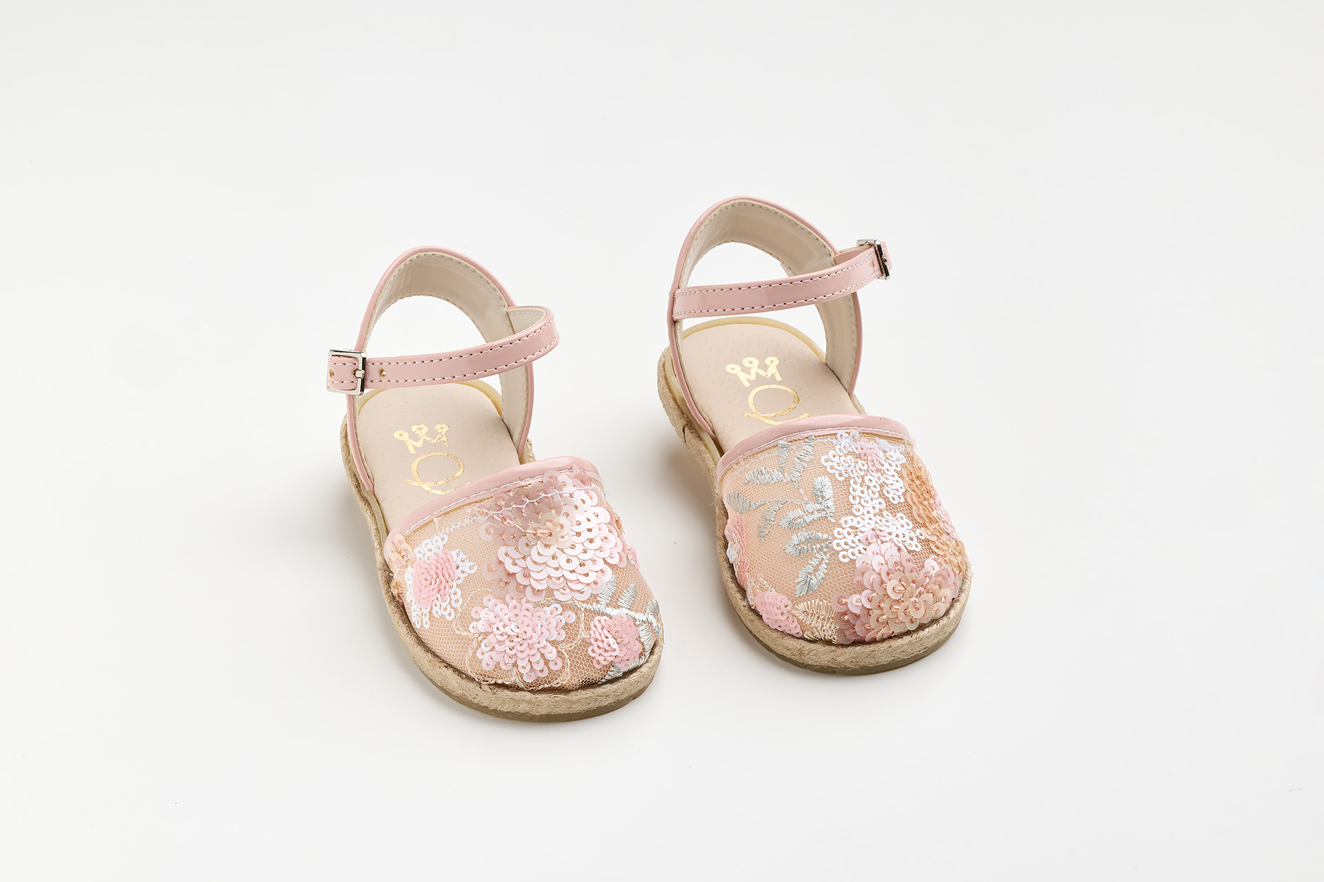 Εσπαντρίγια περπατήματος σε dusty pin K δέρμα και διαφάνεια κεντημένη με παγιέτες.