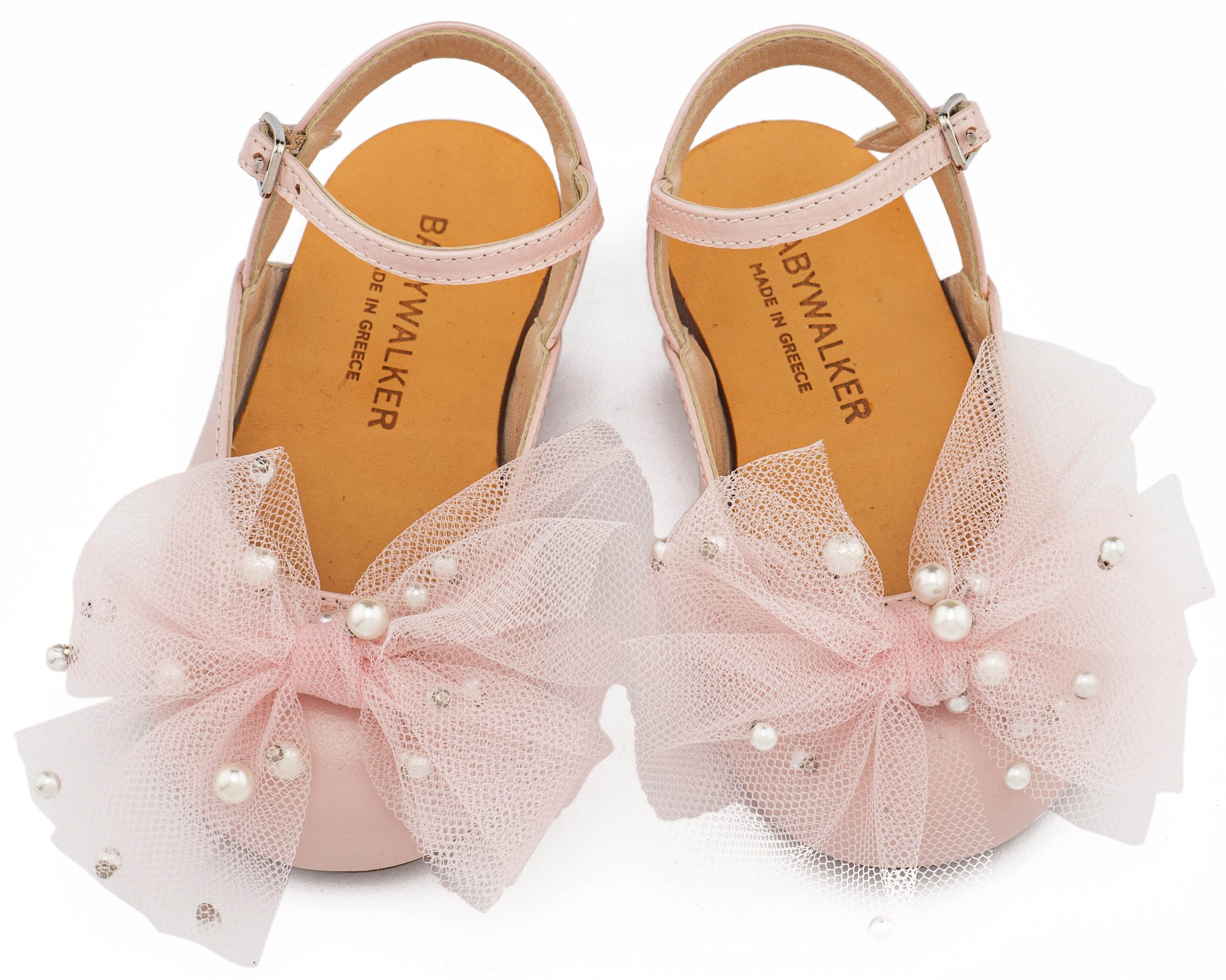 Δερμάτινο Γαλλικό Σαμπό με Χειροποίητο Φιόγκο απ΄π Τούλι και Πέρλες σε Ροζ Χρώμα Νούμερα από 19 έως και 26.