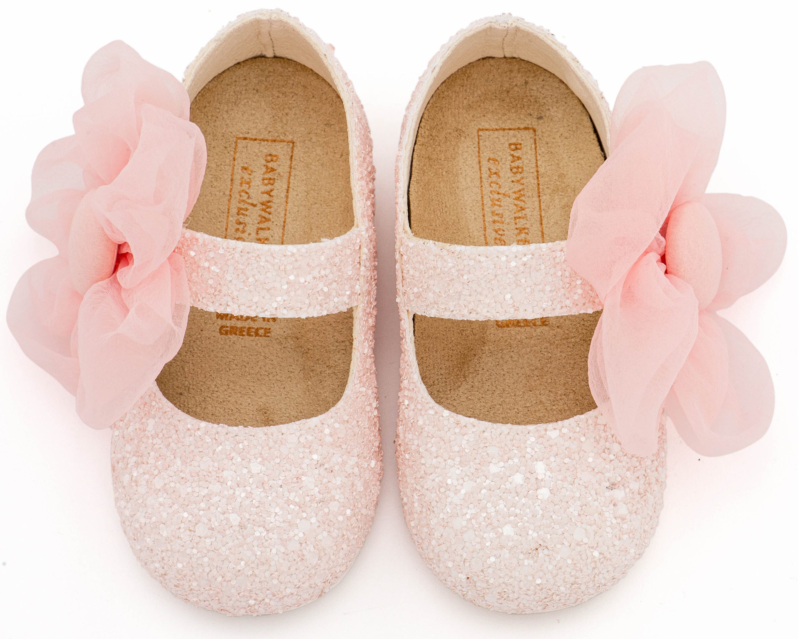 Glitter Γοβάκι Μονή Μπαρέτα Διακοσμημένο με Μεγάλο Λουλούδι Οργάντζας σε Ροζ Χρώμα Νούμερα από 19 έως και 26.