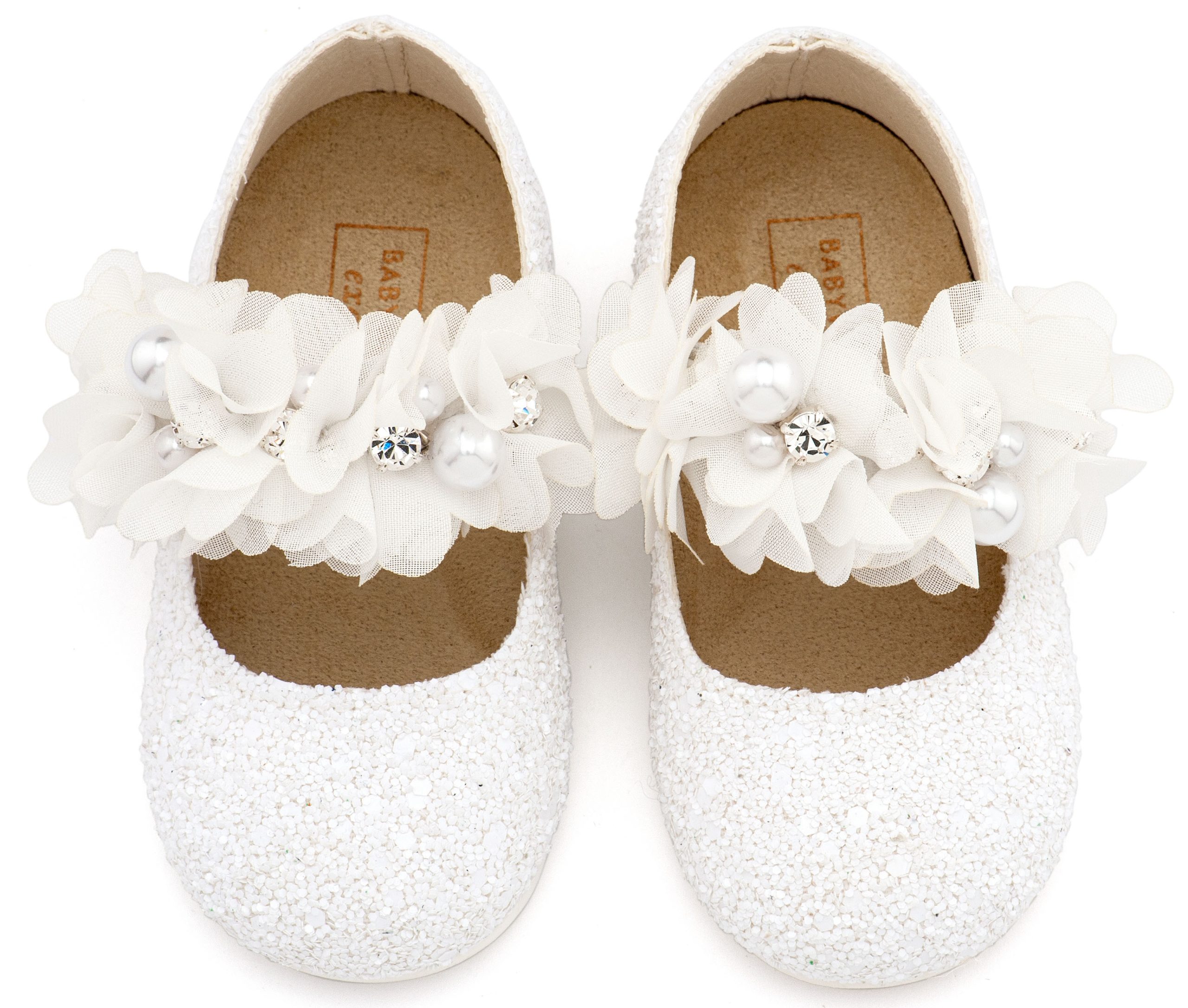 Υφασμάτινο Glitter Γοβάκι Μονή Μπαρέτα Στρας με Λουλούδια Πέρλες και Κρύσταλα Swarovski σε Λευκό Χρώμα Νούμερα από 19 έως και 26.