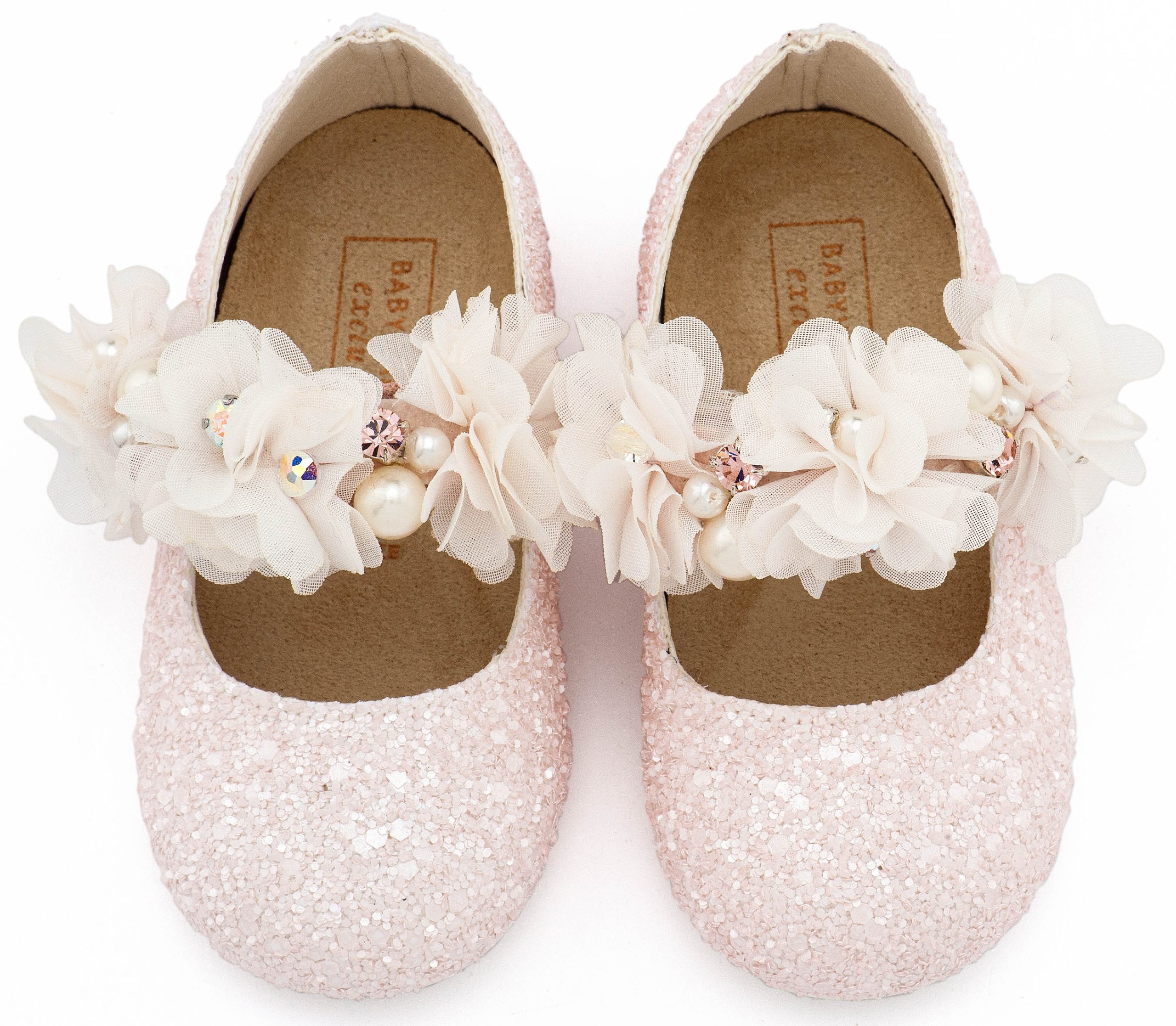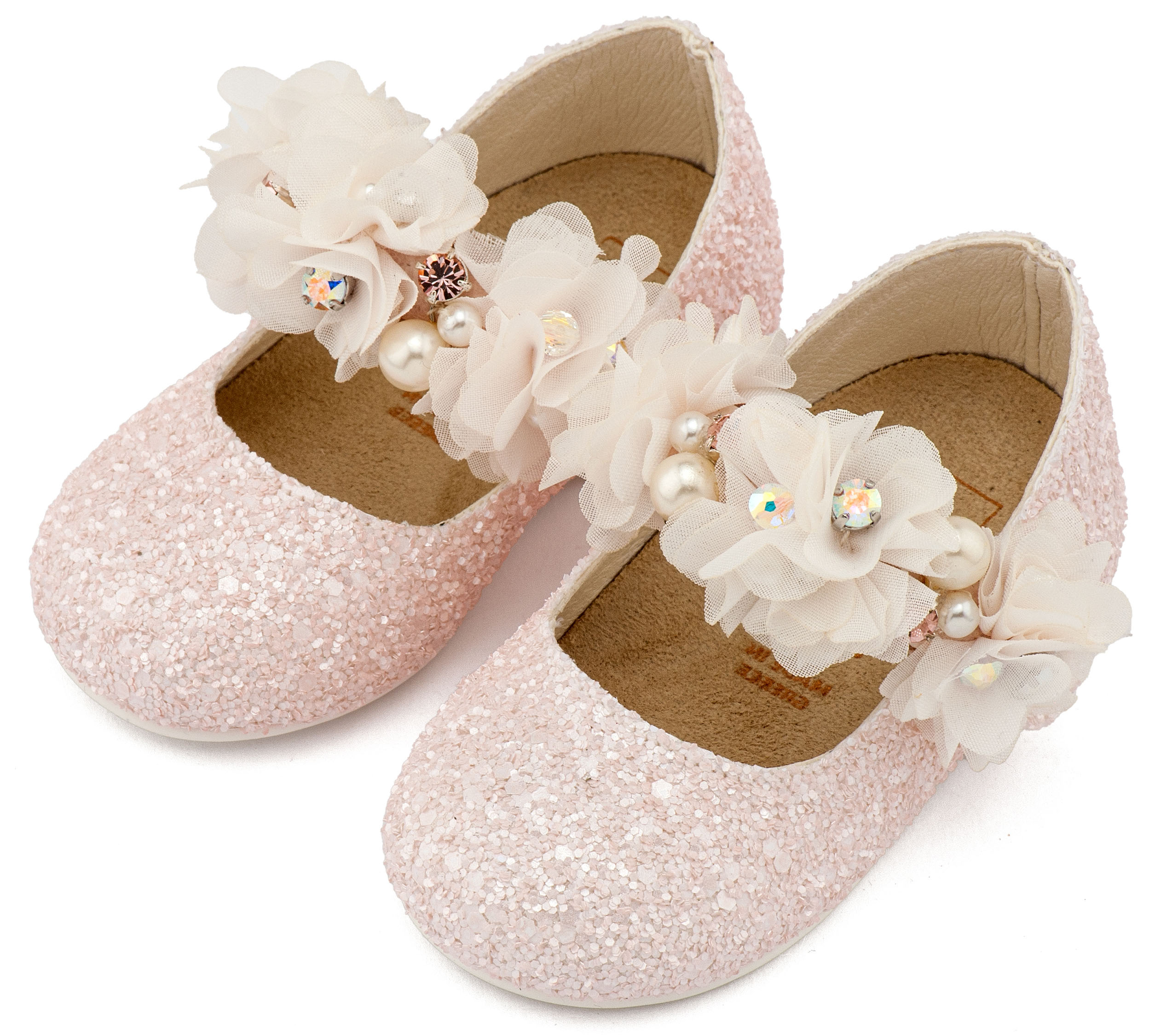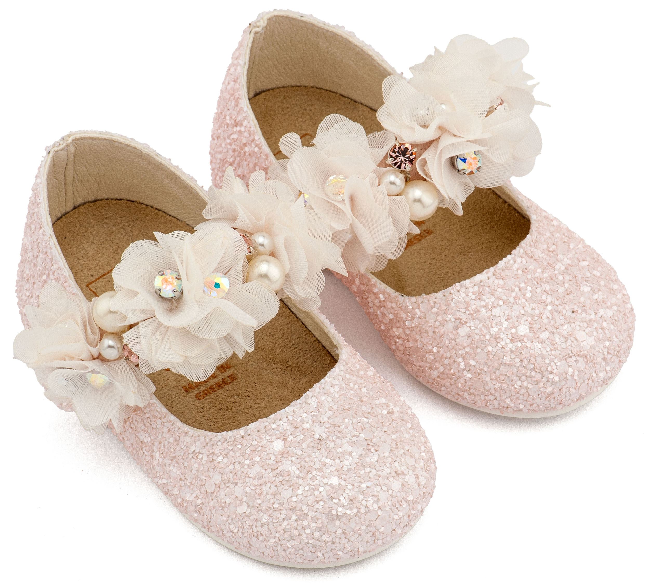 Υφασμάτινο Glitter Γοβάκι Μονή Μπαρέτα Στρας με Λουλούδια Πέρλες και Κρύσταλα Swarovski σε Ροζ Χρώμα Νούμερα από 19 έως και 26.