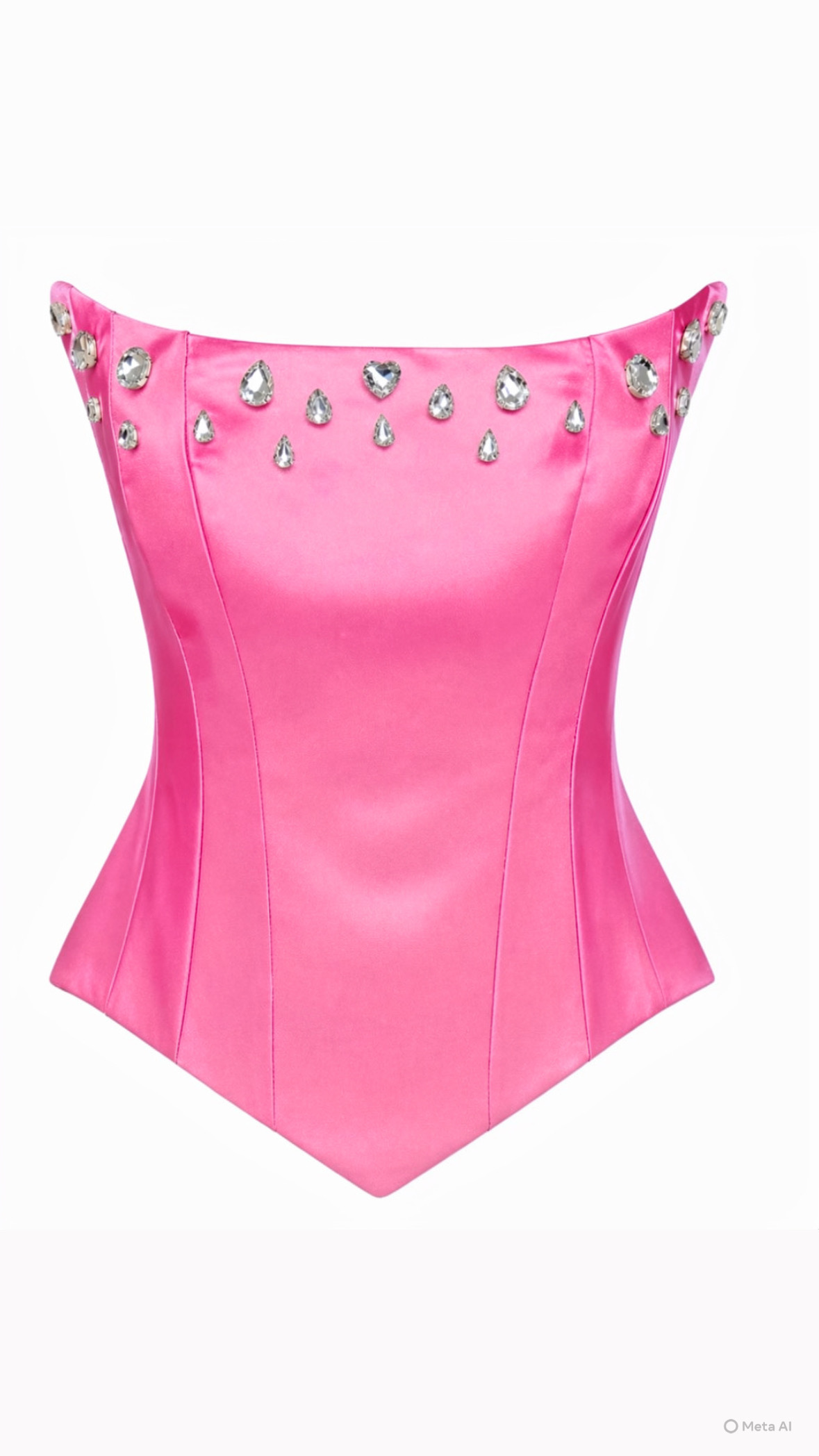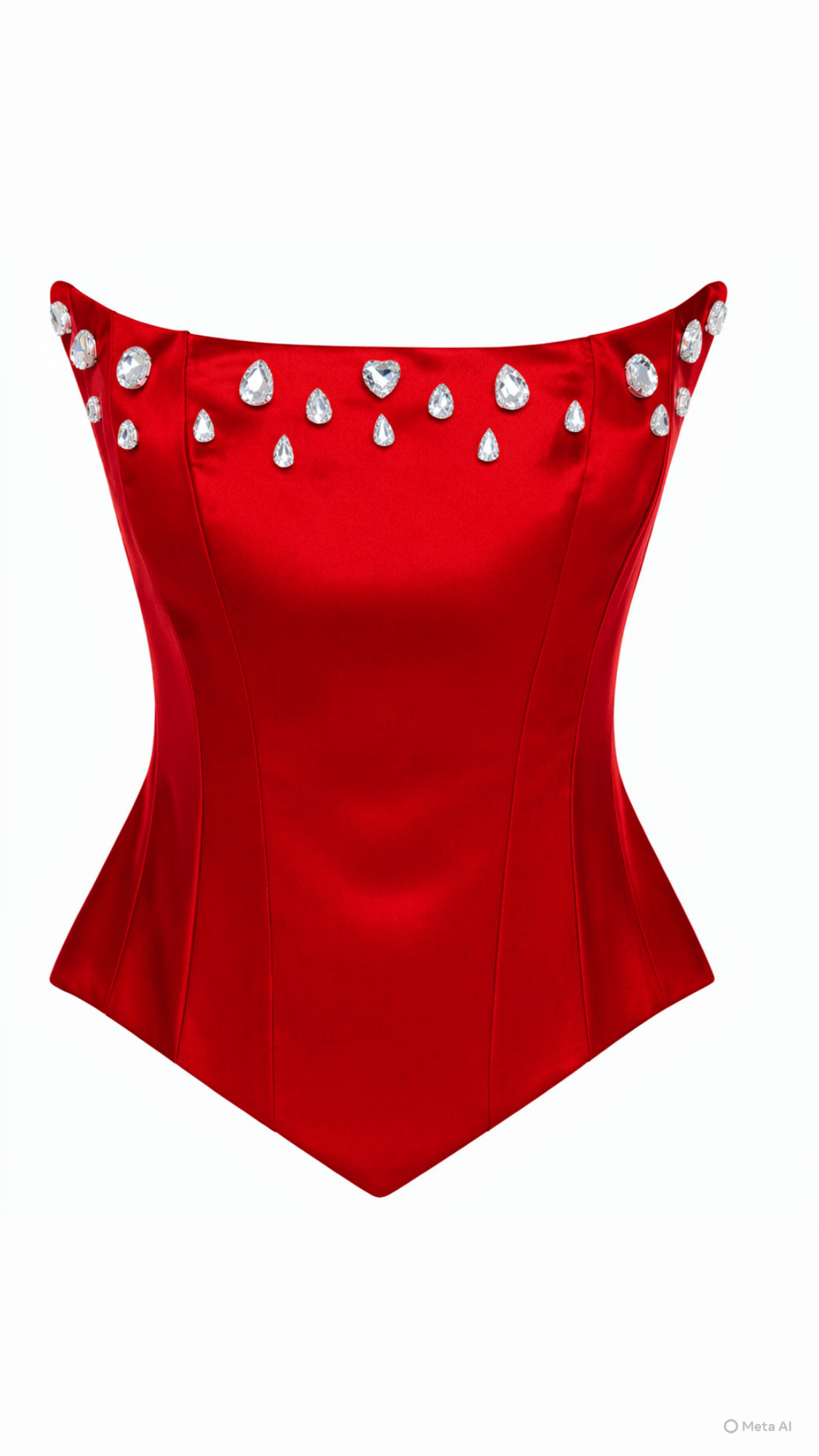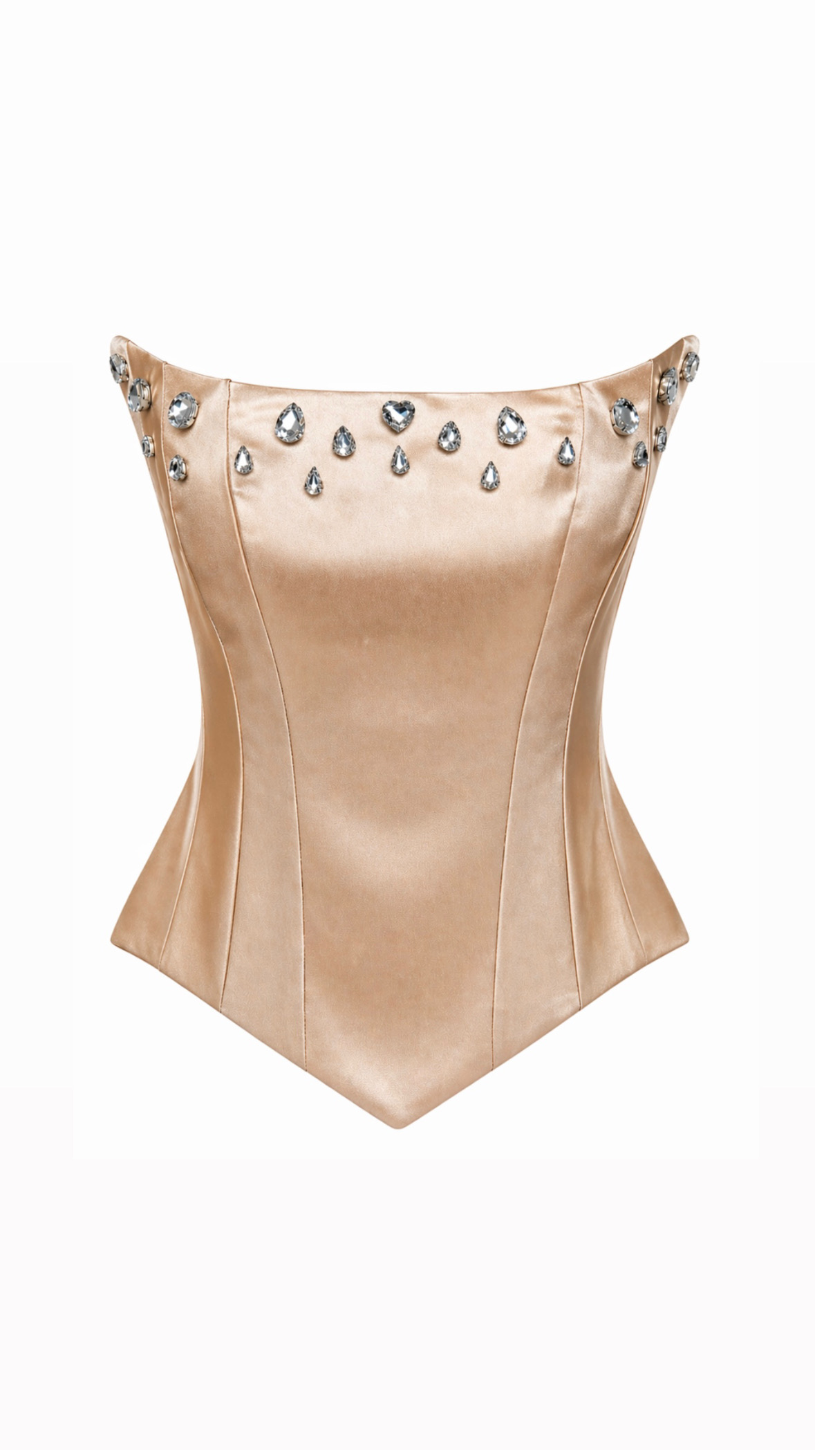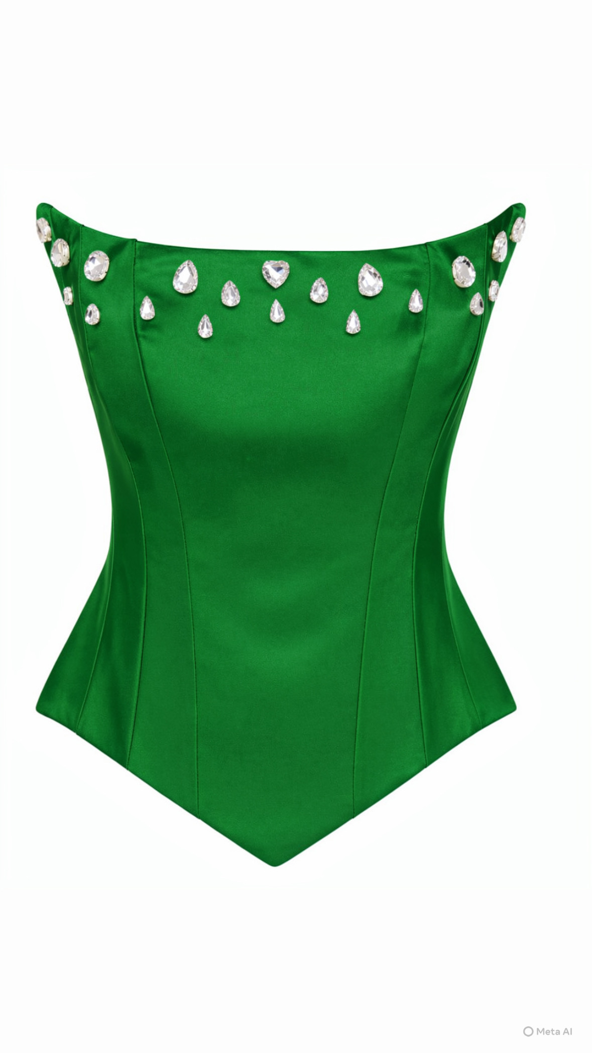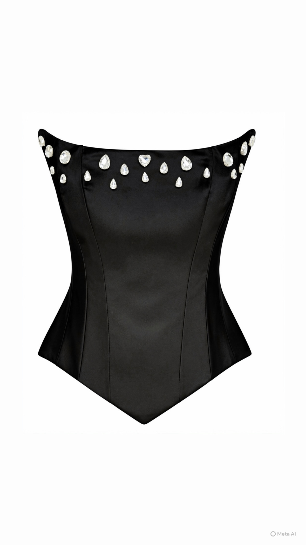 Το μοντέρνο σχέδιο με “μύτες” στο τελείωμα (πιο χαμηλό στα πλάγια και μυτερό μπροστά) δημιουργεί μια ιδιαίτερα κομψή και fashion-forward γραμμή, που ξεχωρίζει σε κάθε εμφάνιση. Στο μπούστο διαθέτει χειροποίητο κέντημα με κρυστάλλους, που χαρίζει λάμψη και πολυτέλεια, κάνοντας το κομμάτι πραγματικό statement.
