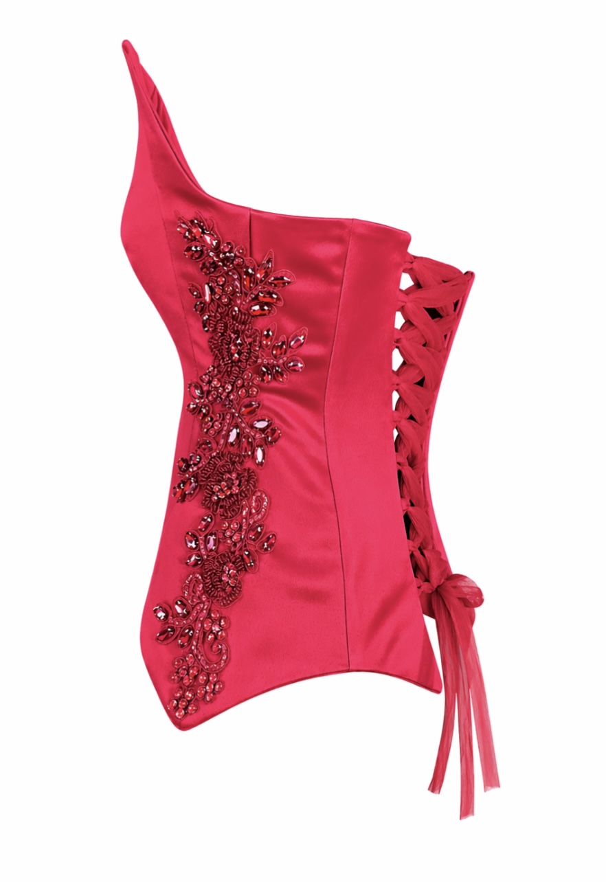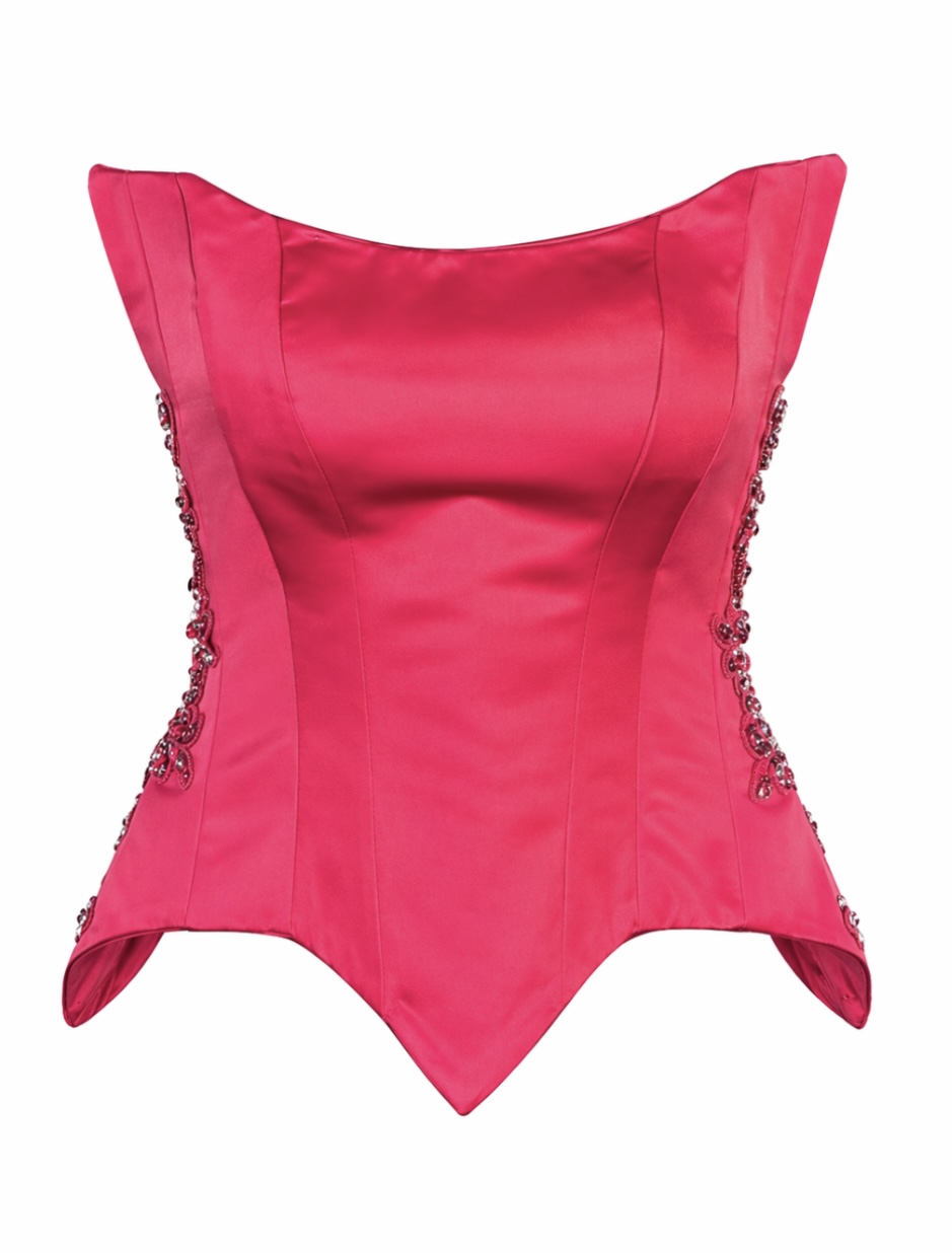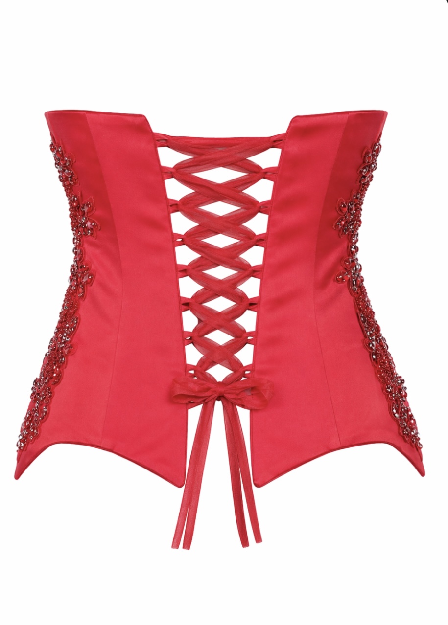 Εντυπωσιακός γυναικείος κορσές από πολυτελές σατέν ύφασμα σε έντονη κόκκινη απόχρωση, σχεδιασμένος να αναδεικνύει τη σιλουέτα με κομψότητα και δυναμισμό. Η ιδιαίτερη δομή του με τις χαρακτηριστικές “μύτες” στο τελείωμα και το sculpted μπούστο δημιουργεί ένα statement couture αποτέλεσμα.
