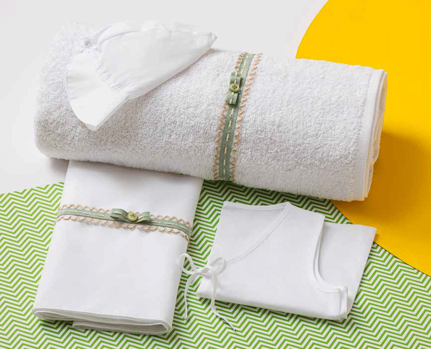 Βαμβακερό σετ λαδόπανων σε λευκό χρώμα με ιδιαίτερη τρέσα από ζικ-ζακ κορδόνια στο χρώμα του σπάγκου και έξτρα τρέσα στο χρώμα της μέντας. Ένα φιογκάκι από την ίδια τρεσα με κουμπάκι στο ιδιο χρώμα ολοκληρωνει την διακόσμηση. Πετσέτα 80*140*450gr2. Πετσέτα παπά 30*40*450gr2. Όλες οι πετσέτες της Lina Baby φέρουν την ετικέτα STANDARD 100 by OEKO-TEX® (Αυτό σημαίνει ότι τα προϊόντα δεν περιέχουν επιβλαβή επίπεδα χημικών ουσιών. )