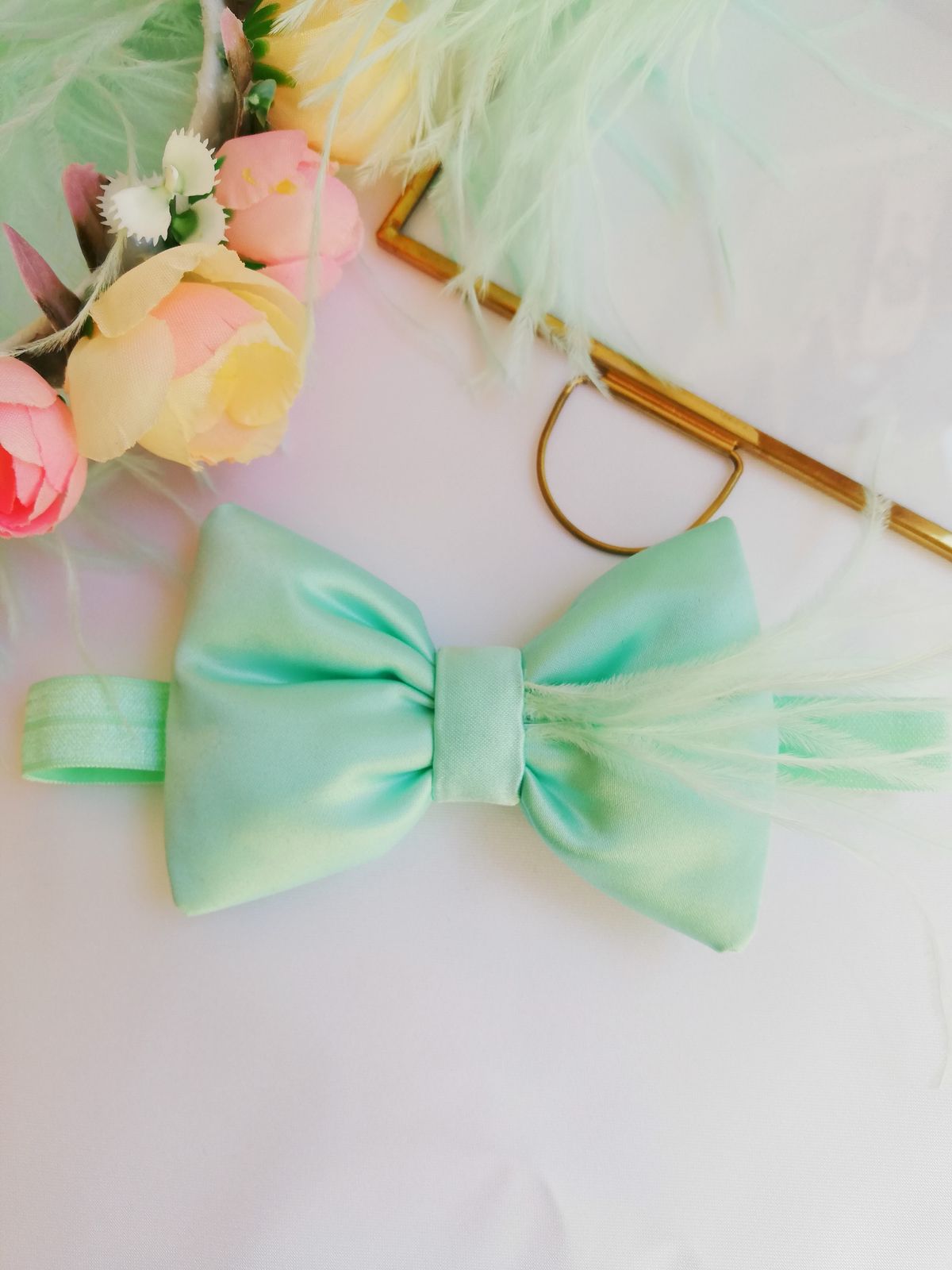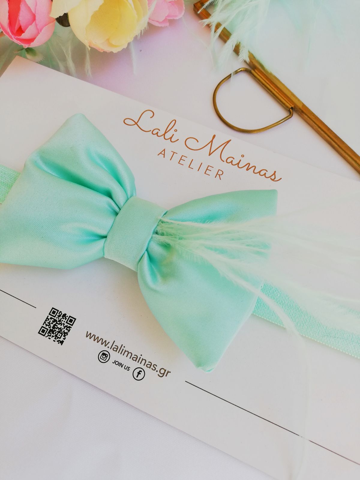 Σε απόχρωση μέντας κορδέλα με φουσκωτό σατέν φιόγκο και φτερό στην ίδια απόχρωση και με εξαιρετικά