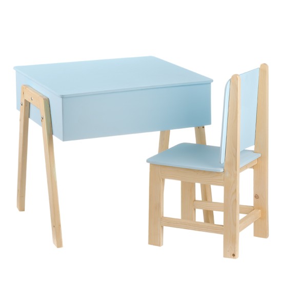 Ο λιτός και μοντέρνος σχεδιασμός με φυσικό ξύλο και απαλή σιέλ επιφάνεια δημιουργεί μια ζεστή και κομψή εικόνα. Το γραφείο διαθέτει αποθηκευτικό χώρο κάτω από το καπάκι, ιδανικό για τη φύλαξη σχολικών ειδών, παιχνιδιών ή αναμνηστικών.