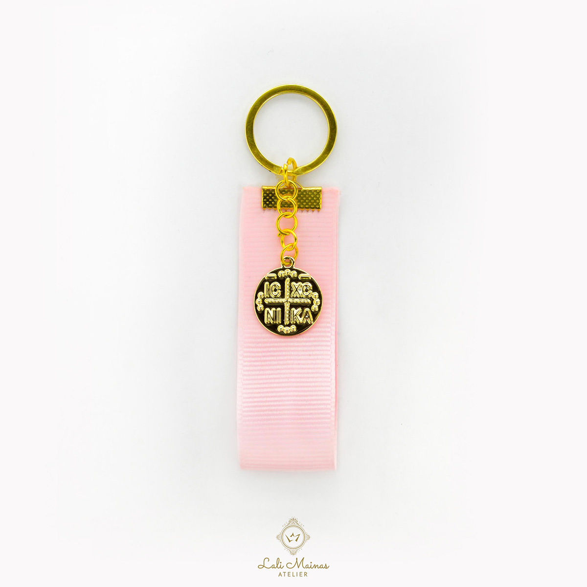 Κομψό μαρτυρικό μπρελόκ για βάπτιση κοριτσιού, σε χρυσό χρώμα, με διπλή ροζ κρο κορδέλα, χρυσό κρίκο και διακοσμητικό Κωνσταντινάτο, δημιουργώντας ένα τρυφερό και εκλεπτυσμένο αποτέλεσμα.