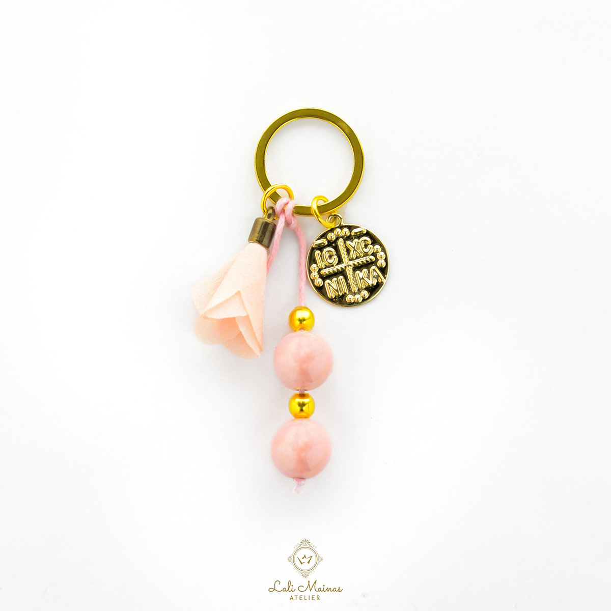 Κομψό μαρτυρικό μπρελόκ για βάπτιση κοριτσιού, σε χρυσό χρώμα, με υπέροχο κρεμαστό λουλούδι από ύφασμα οργάντζα σε ροζ, διακοσμητικό Κωνσταντινάτο, ροζ χάντρες και χρυσές μπίλιες, δημιουργώντας ένα τρυφερό και εκλεπτυσμένο αποτέλεσμα.