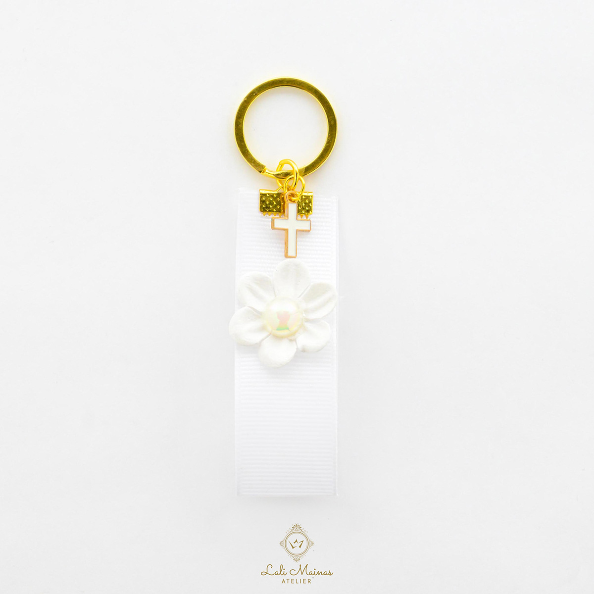 Ρομαντικό και κομψό μαρτυρικό μπρελόκ σε χρυσή απόχρωση, διακοσμημένο με διπλή κορδέλα που χαρίζει όγκο και ιδιαίτερη αισθητική. Το χειροποίητο λευκό λουλούδι με πέρλα στο κέντρο προσθέτει μια φίνα και τρυφερή πινελιά, ιδανική για βάπτιση.
