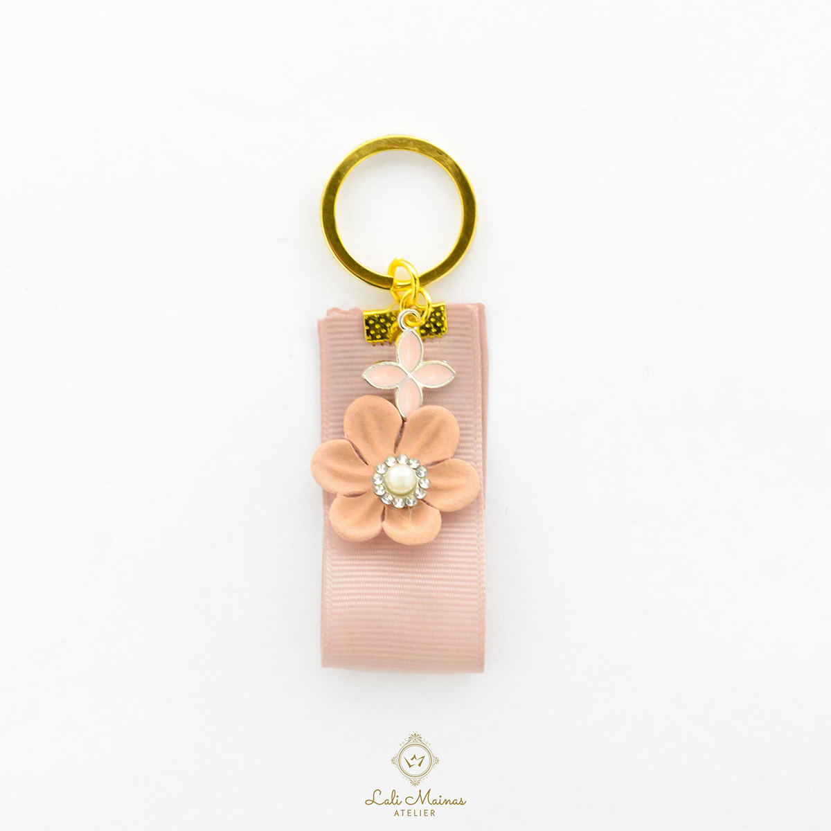 Μαρτυρικό Βάπτισης Μπρελόκ σε Χρυσό με Nude Κορδέλα, Χειροποίητο Λουλούδι & Σταυρό σε Nude Χρώμα