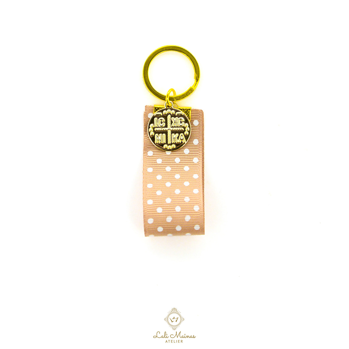 Κομψό και μοντέρνο μαρτυρικό μπρελόκ σε χρυσή απόχρωση, ιδανικό για μια ξεχωριστή βάπτιση. Η κορδέλα κρο με πουά σχέδιο προσθέτει παιχνιδιάρικη και ταυτόχρονα φίνα αισθητική.