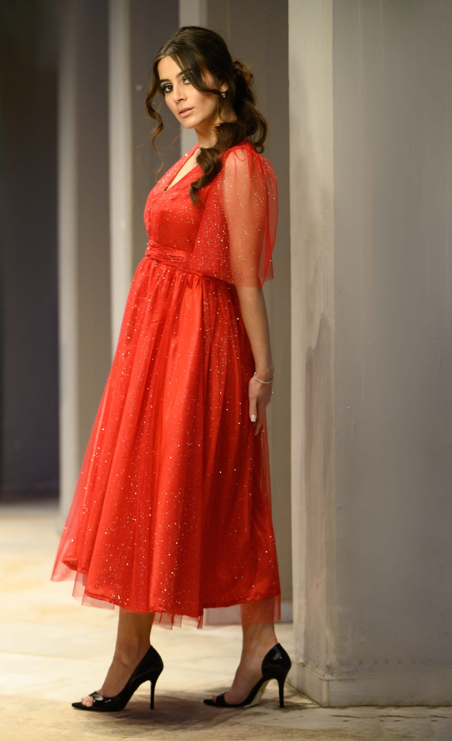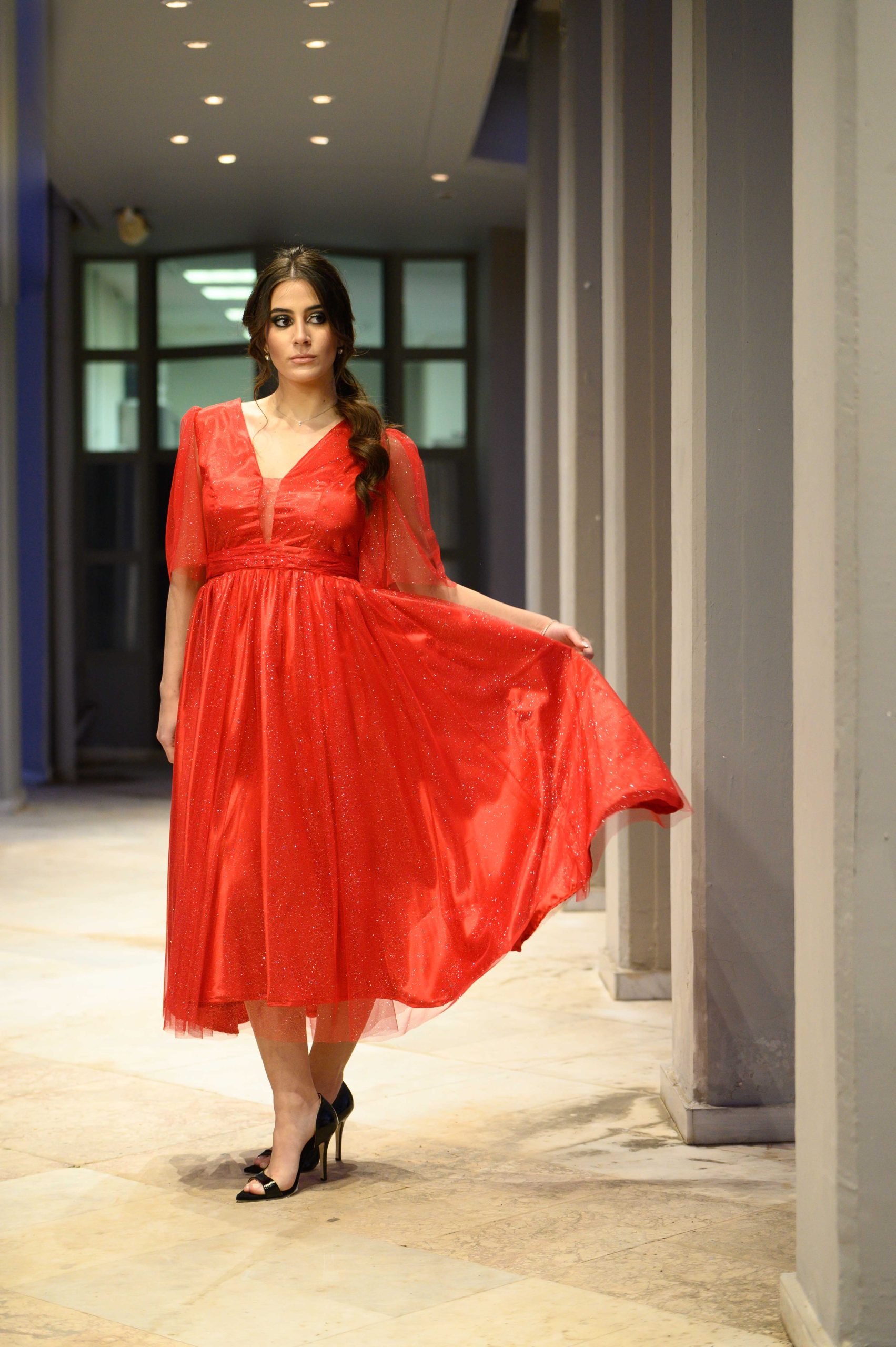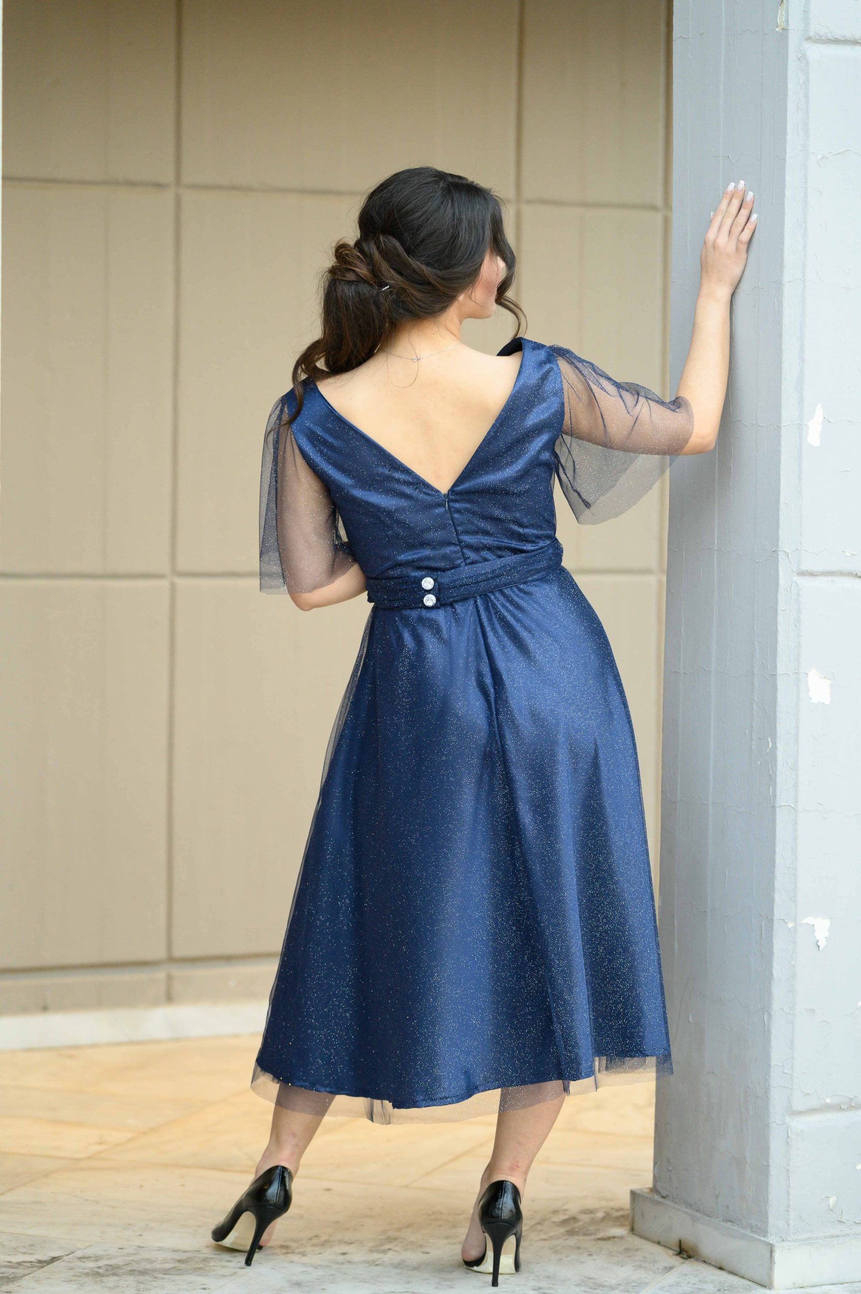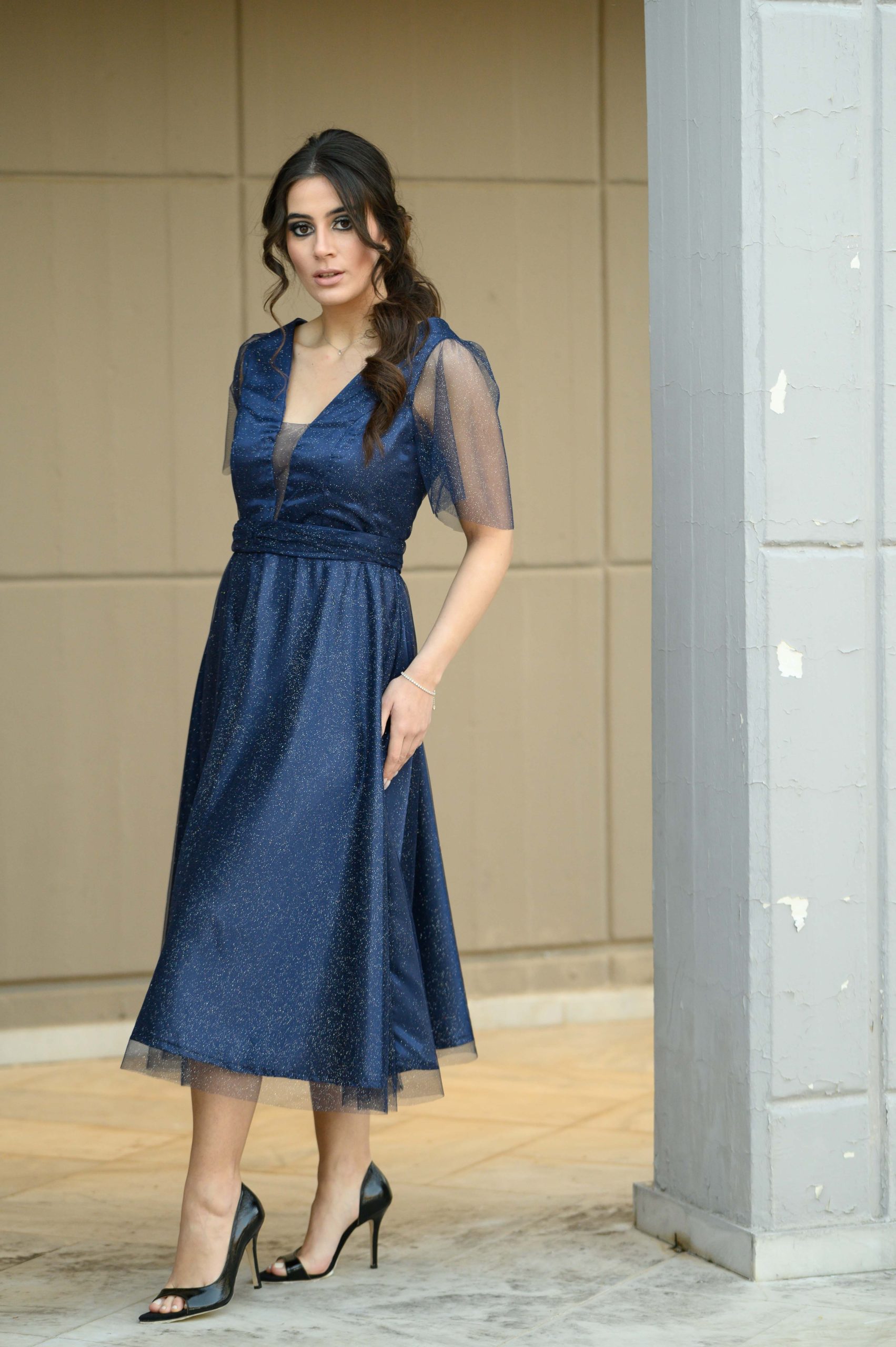 Μίντι φόρεμα σε Α-γραμμή με ύφασμα σατέν με έντονο γκλίτερ από πάνω με βαθύ ντεκολτέ με διαφάνια μπροστά και άνοιγμα V στη πλάτη.