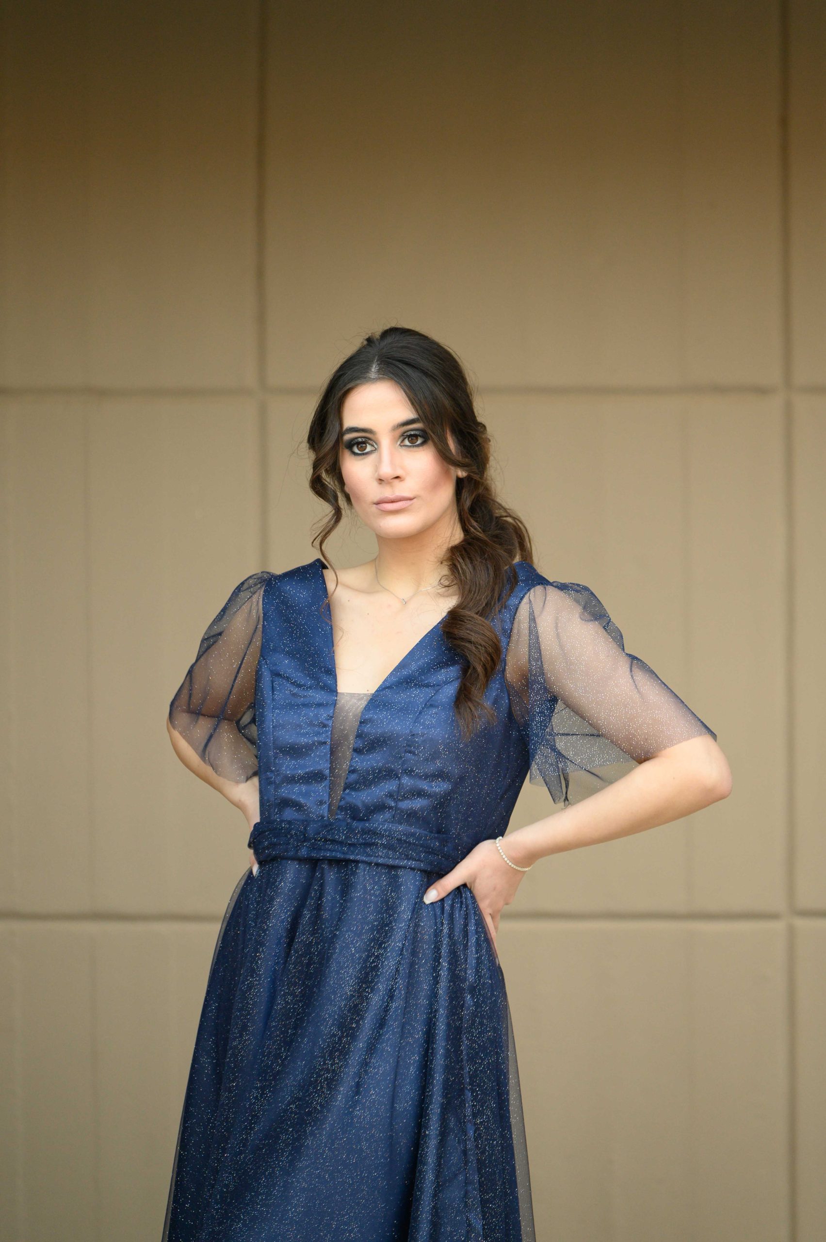 Πρόσθετη ζώνη που κλείνει με Swarovski κουμπιά πίσω και βολάν μανίκι με διαφάνια και κλείνει με αόρατο φερμουάρ πίσω.
