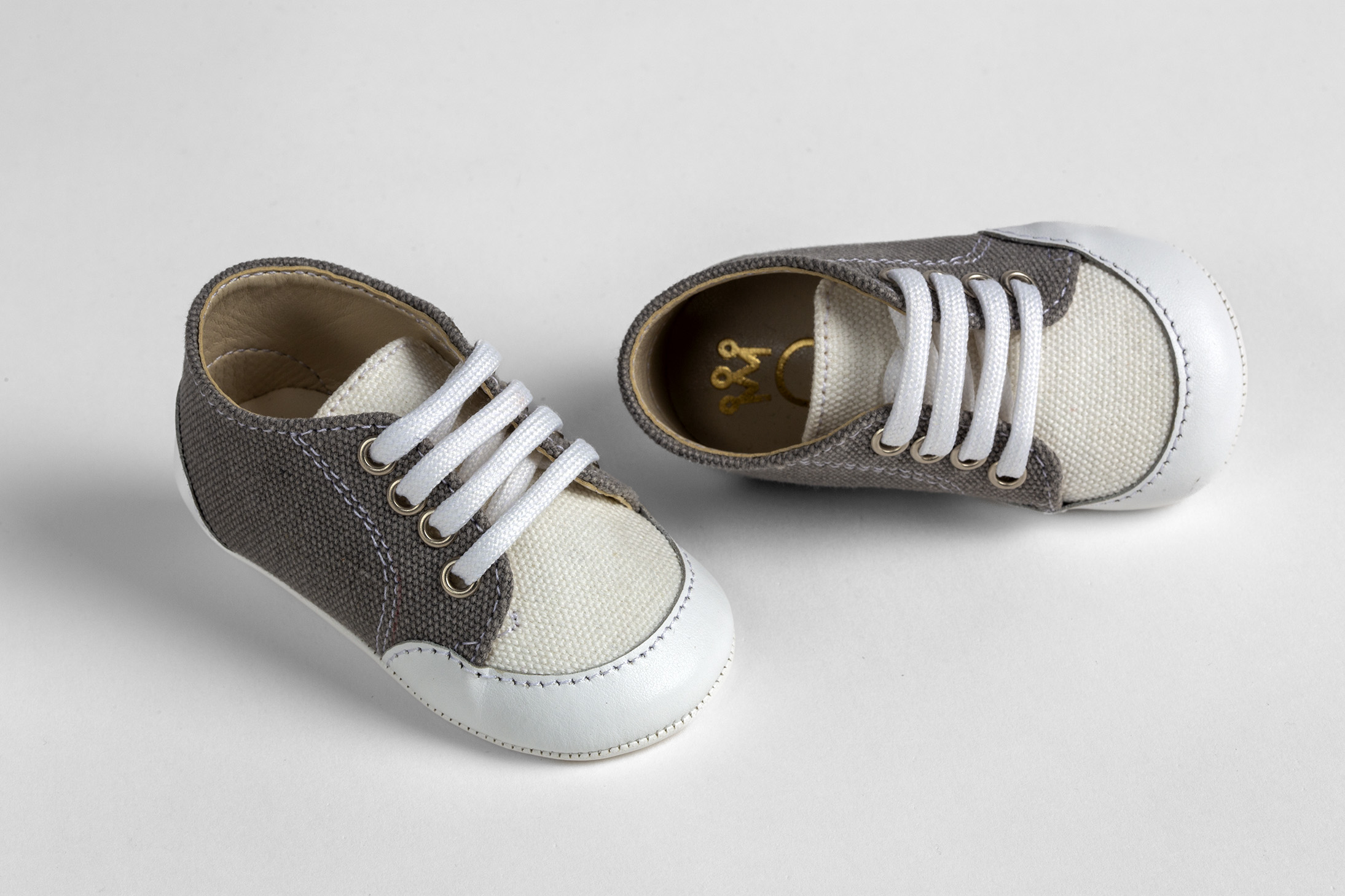 Παπουτσάκι αγκαλιάς σε λευκό δέρμα, γκρι και λευκό ύφασμα. Νούμερα 16-19.