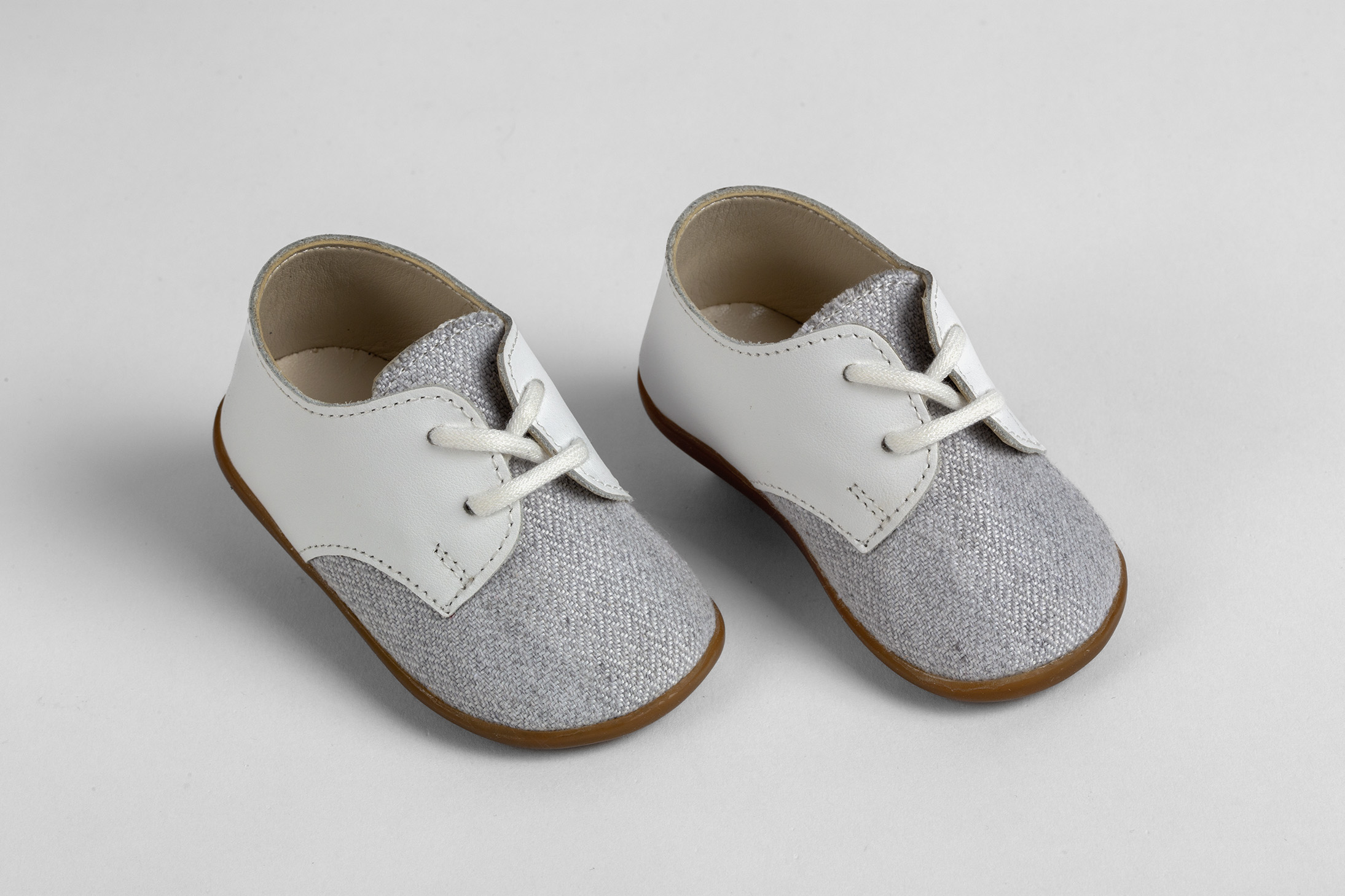 Παπουτσάκι για τα πρώτα βήματα σε λευκό δέρμα και γκρι ύφασμα. Νούμερα 18-21.