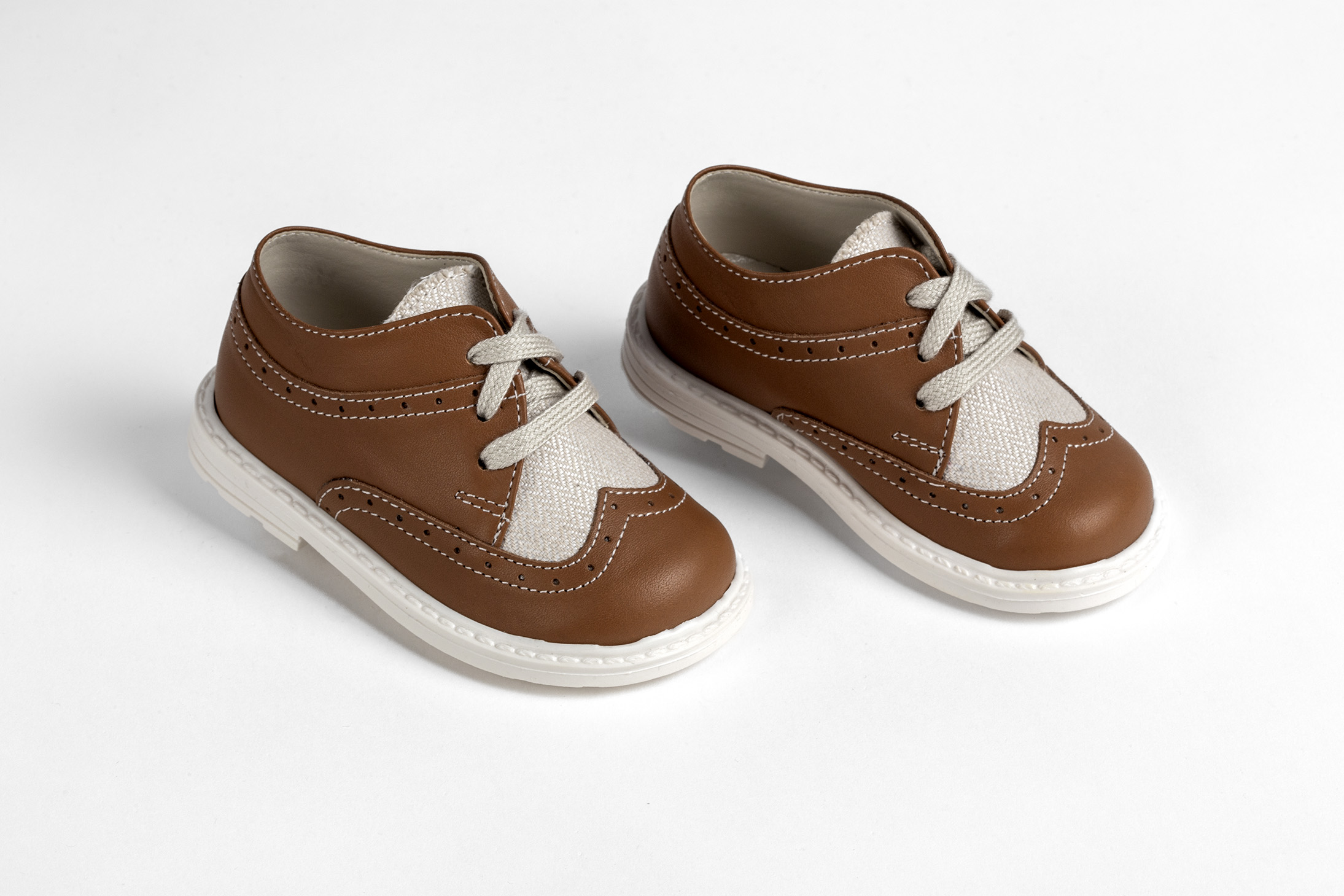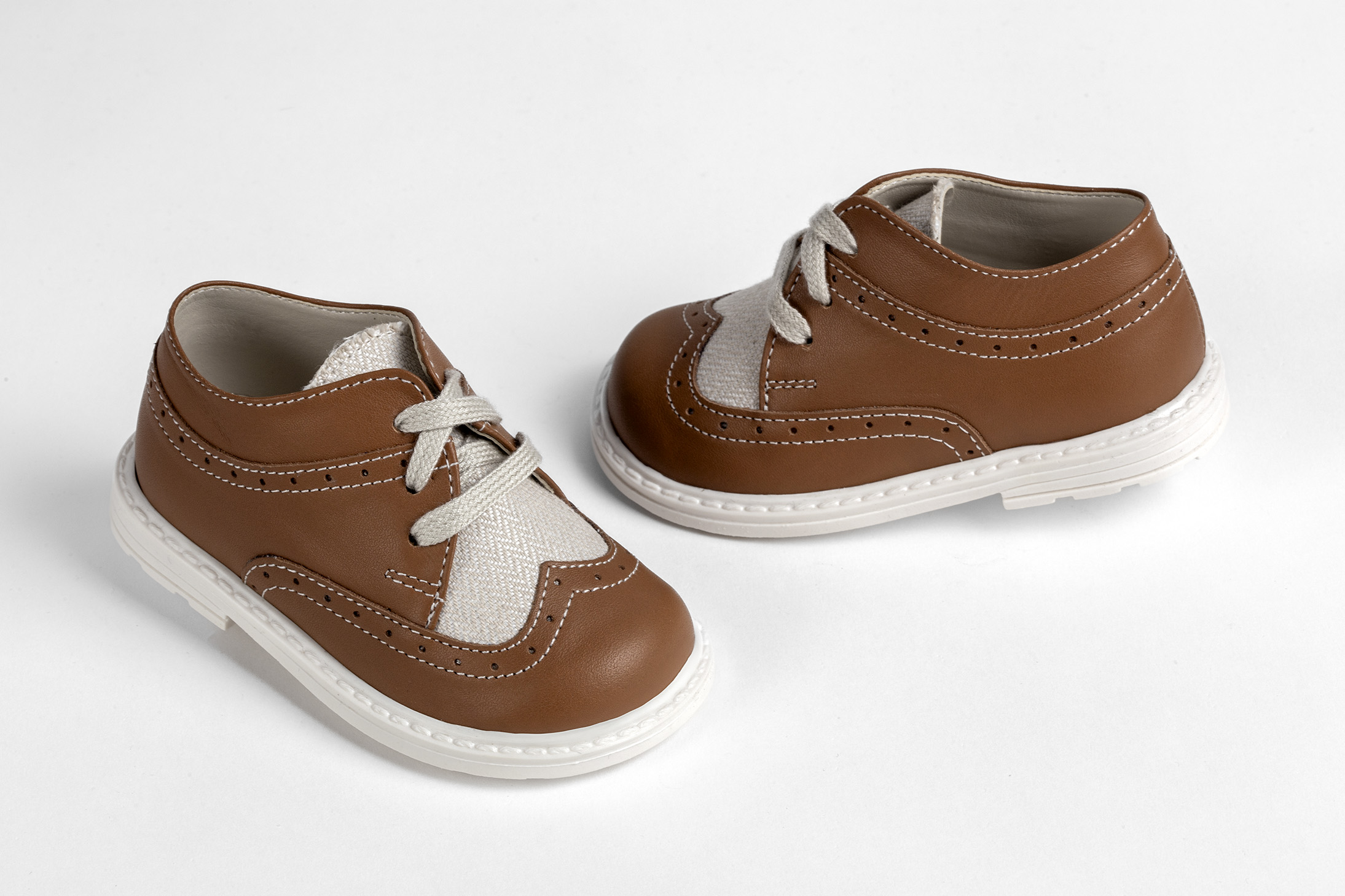 Παπούτσι περπατήματος τύπου brogues σε ταμπα δέρμα και μπεζ ύφασμα. Νούμερα 19-27.