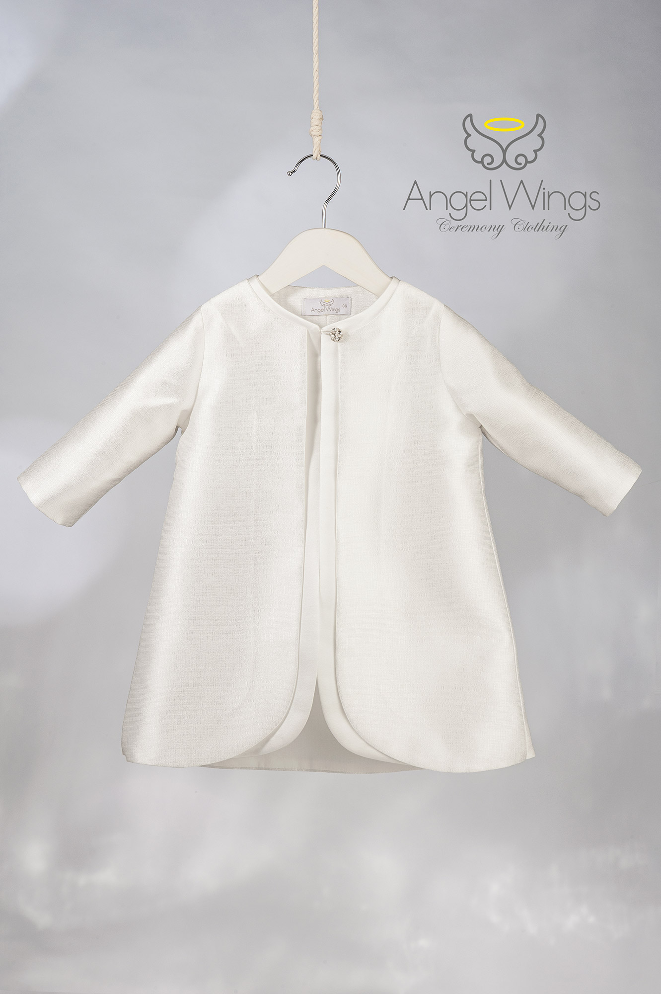 Ένα εκλεπτυσμένο μαντό σε γραμμή Α, κατασκευασμένο από φίνο ταφτά και πολυτελές off-white σατέν ύφασμα, που αποπνέει κομψότητα και διαχρονική φινέτσα.