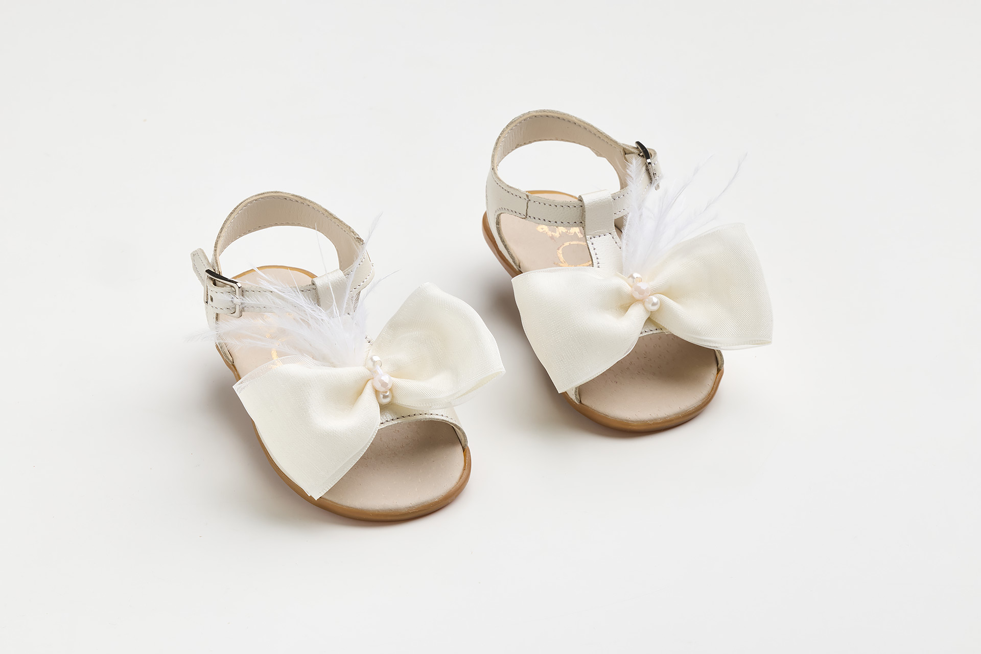 Σανδάλι για τα πρώτα βήματα από εκρού δέρμα και χειροποίητο φιόγκο με φτερά.