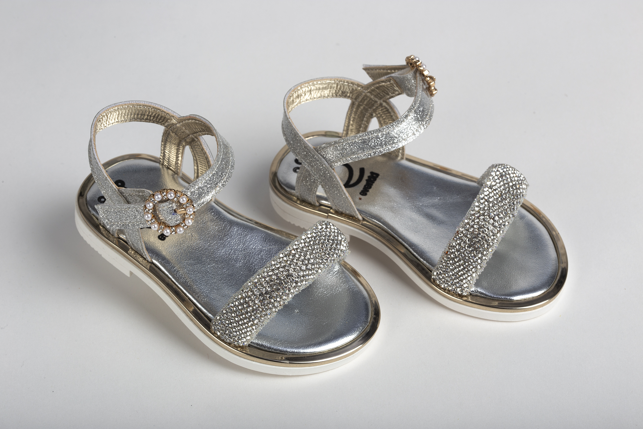 Σανδάλι περπατήματος σε χρυσό δέρμα διακοσμημένο με τούλι και φτερά σε λευκό και πέρλες