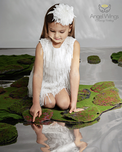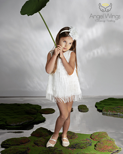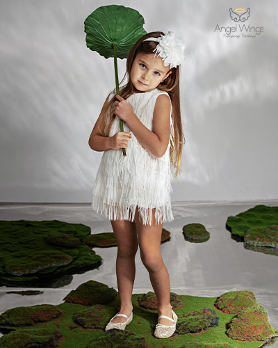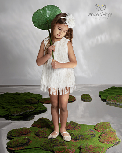 Ένα εξαιρετικά κομψό φόρεμα σε γραμμή Α, που αποπνέει διαχρονική νοσταλγική φινέτσα, κατασκευασμένο από μοναδικό ύφασμα με κρόσσια σε εκλεπτυσμένη off-white απόχρωση. Η λιτή αλλά άψογα ισορροπημένη γραμμή του, σε συνδυασμό με την ιδιαίτερη υφή του υφάσματος, το καθιστά ιδανική επιλογή για υψηλής αισθητικής βαπτίσεις και εκδηλώσεις.