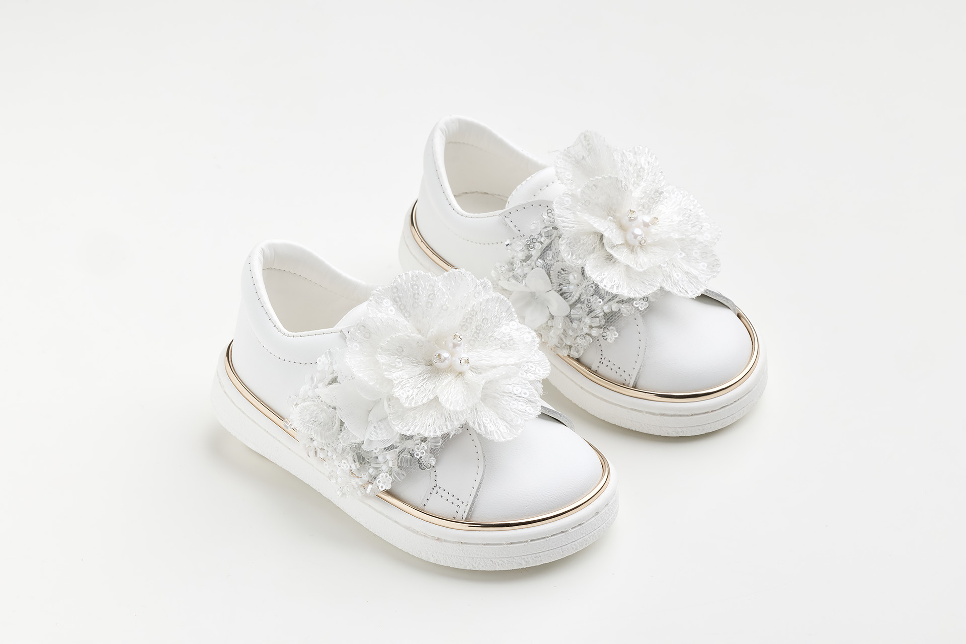 Sneaker περπατήματος σε λευκό δέρμα με χειροποίητο διακοσμητικό από δαντέλα και λουλούδι κεντημένα με χάντρες και παγιέτες