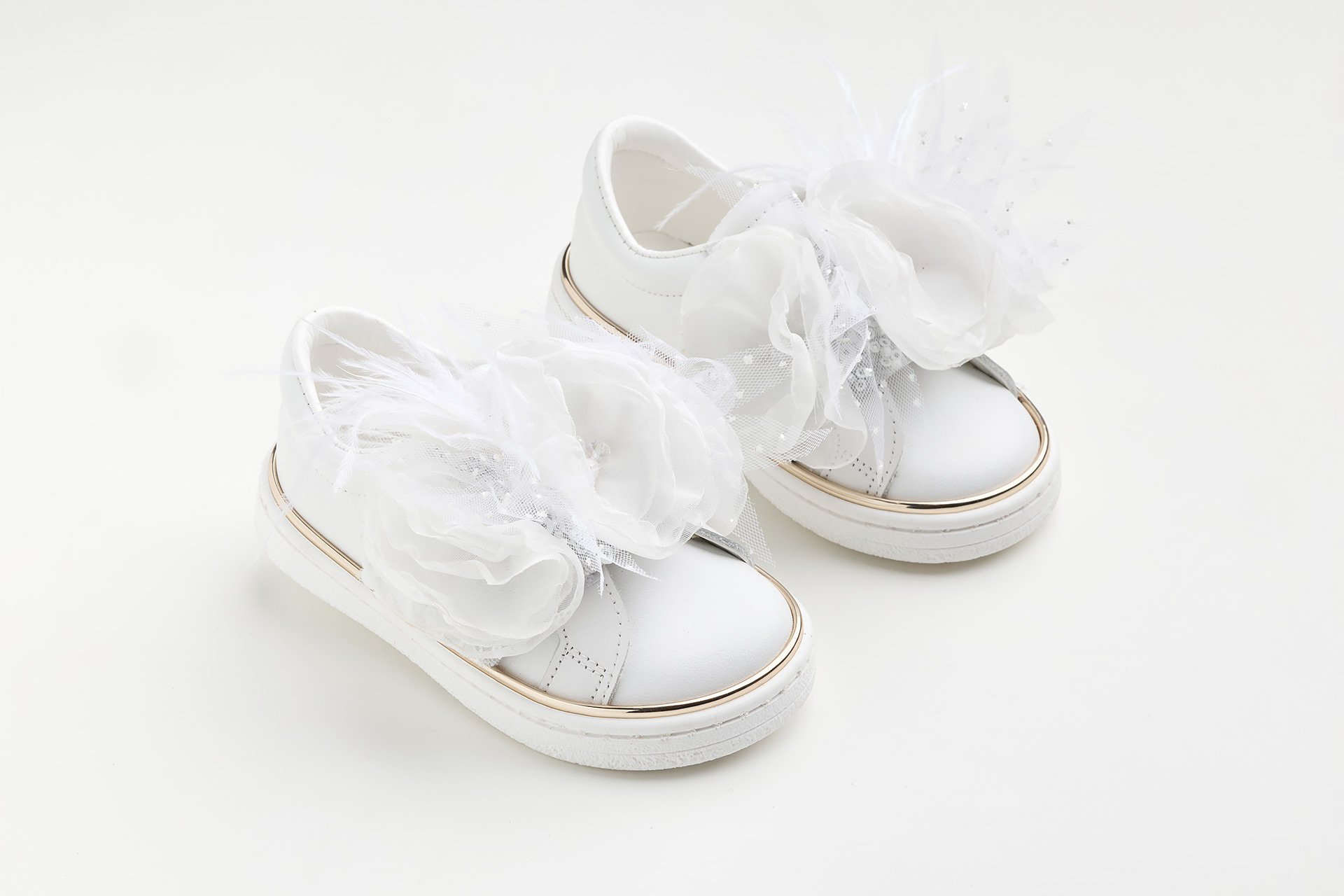 Sneaker περπατήματος σε λευκό δέρμα με χειροποίητο διακοσμητικό από μουσελίνα γκλιτερ τούλι και φτερά