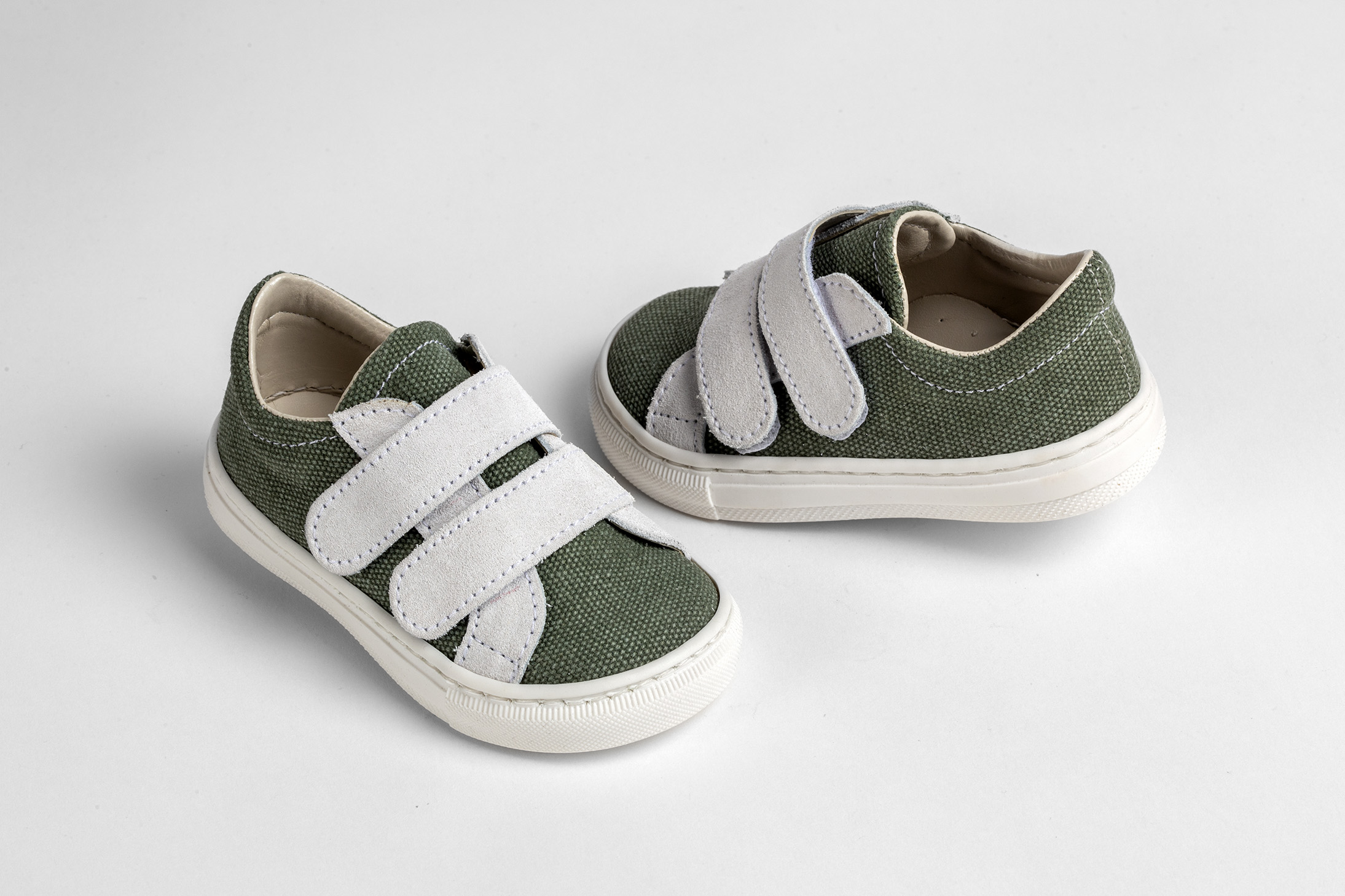 Sneaker περπατήματος σε λευκό καστόρ δέρμα και λαδί καμβά. Νούμερα 19-27.