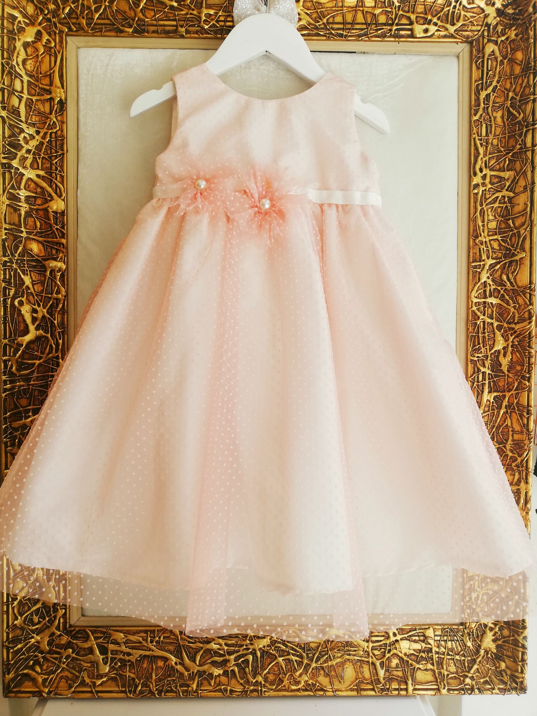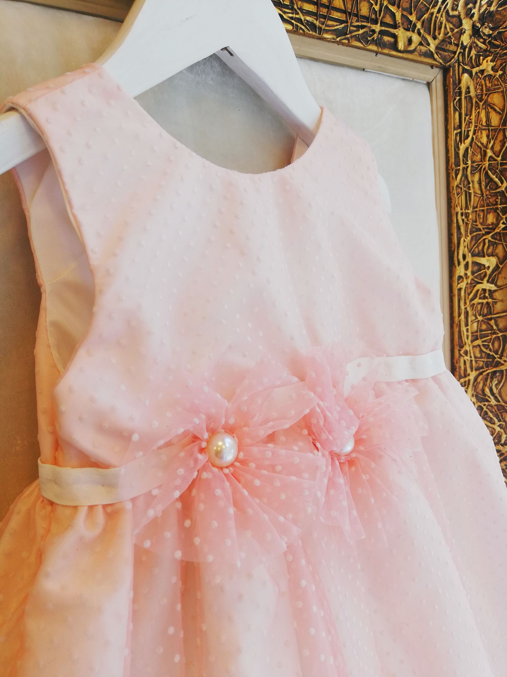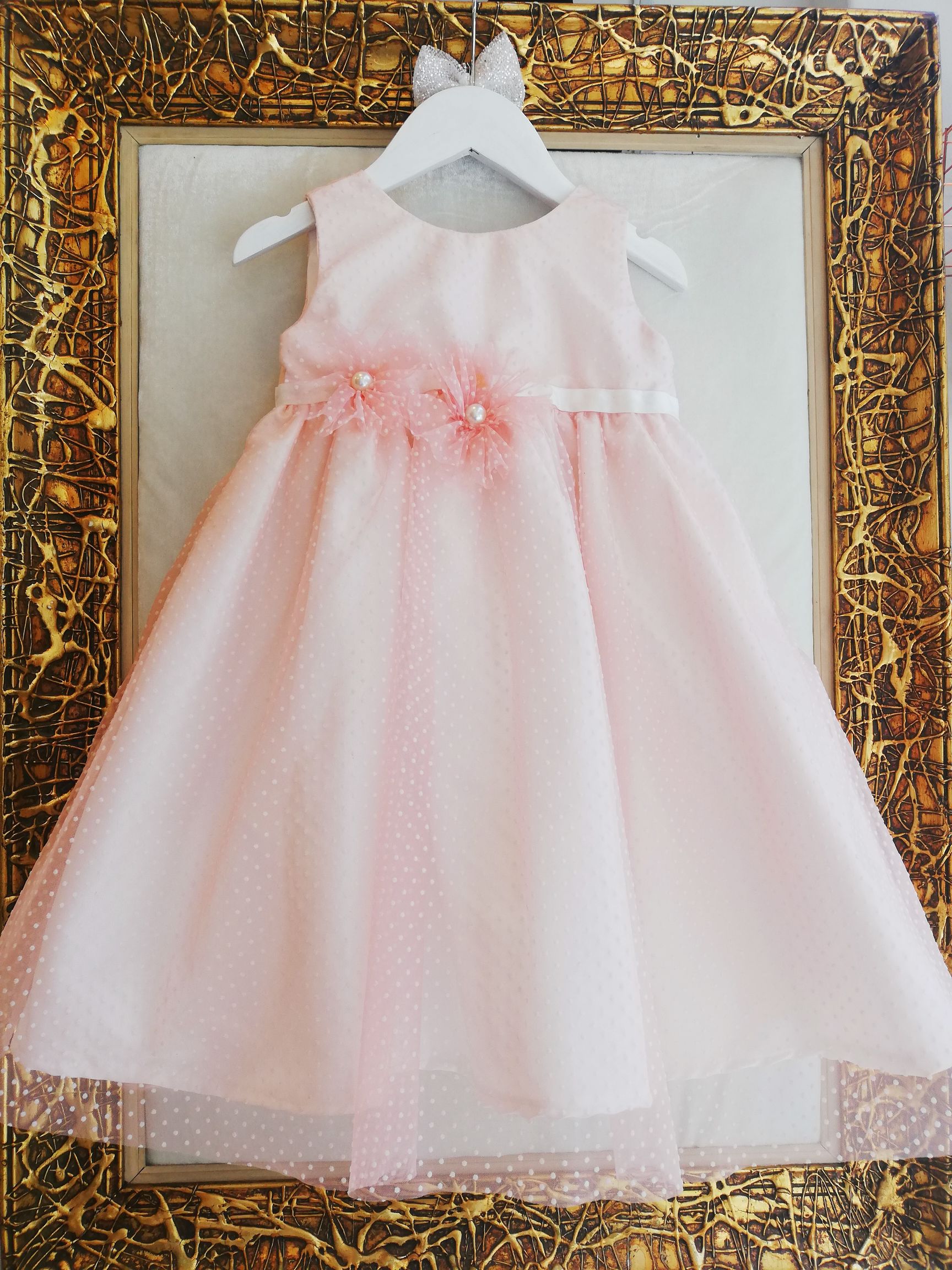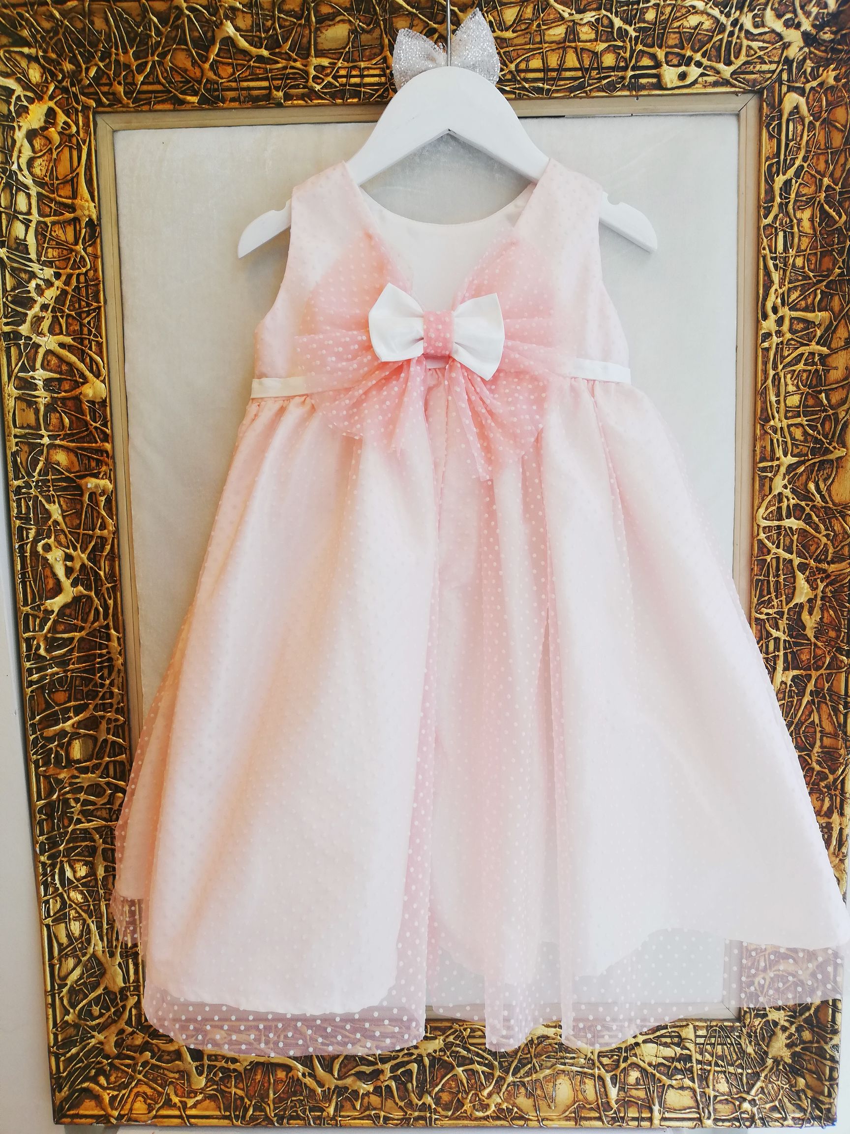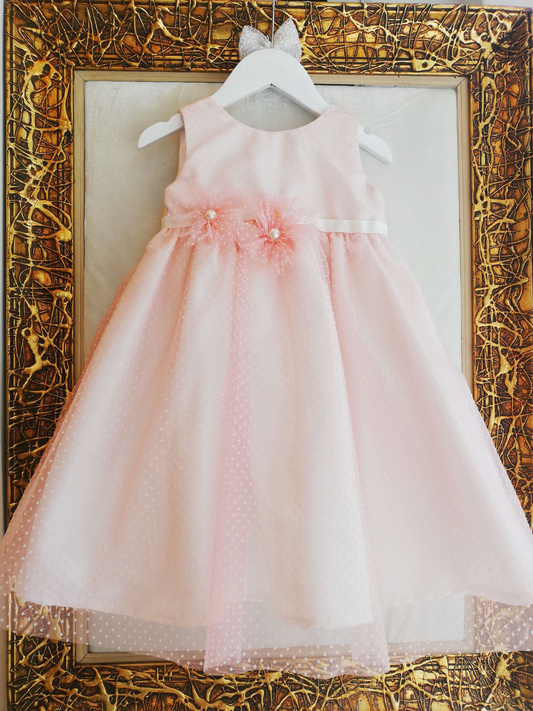 Χειροποίητο Βαπτιστικό Φόρεμα Eliza σε Α-γραμμή. Με ύφασμα ταφτάς με ροζ πουά τούλι από πάνω.